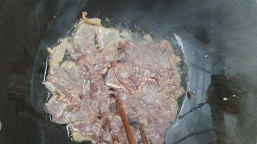 咚咚提醒:猪肝滑散时,时间不要久,大约十秒左右。猪肝切好后用清水清洗几遍可以有效的去除腥味;猪肝沥干水分后加料酒和淀粉抓匀,可以保持猪肝鲜嫩的口感;油温需要烧至7成热才下猪肝,油温太低的话就是炒猪肝不是爆猪肝了。
