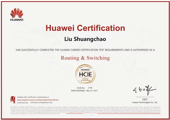 通过技能大赛的锤炼,刘双超练就了一身的网络本领,他决定冲击网络世界最高级别的网络认证—华为HCIE认证。回忆起备考的过程,刘双超表示:虽然每天都在枯燥的学习中度过,甚至有时候跟小伙伴们讨论到凌晨1-2点,在这个过程中让我认识到了网络的渊博,也认清了自我,使我对以后的工作有了方向。