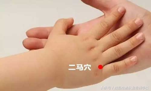 二马穴在小手指和无名指指关节的后面,用拇指去轻柔就可以,就像图上的位置。二马穴也叫聪明穴,常揉二马穴可温补下元、滋阴补肾,孩子不爱喝水、湿气重也可以帮孩子利尿,好处太多了。每天顺时针按揉5分钟。