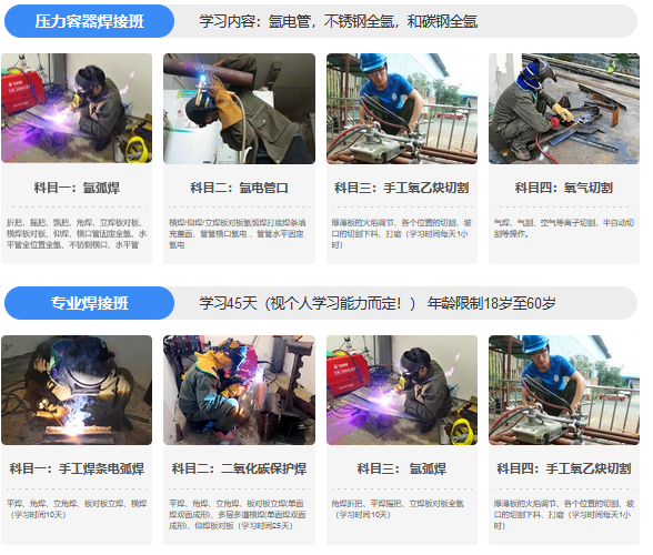 焊工培训:焊工培训报名费用为5600元,学习时间一般是在45-60天,费用包括技术培训费以及焊工服费用,同样不包括考取焊工证,焊工证报考费用为1188元,焊工培训班基本上市面上所有常用的焊接手法都会教,比如手把电焊,二氧化碳保护焊,氩弧焊,氩电联焊,每天都是以实操实训为主,每天的焊接耗材无限量供应,学校相信只有真正多练习,才能学好焊工技术。(同时学费也不包括住宿和伙食费)