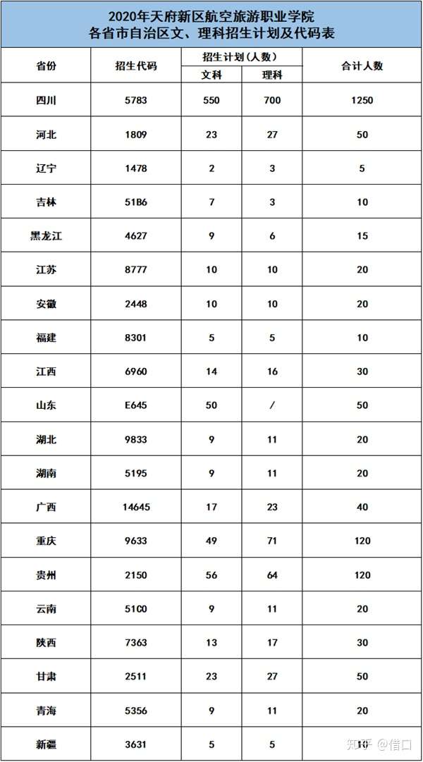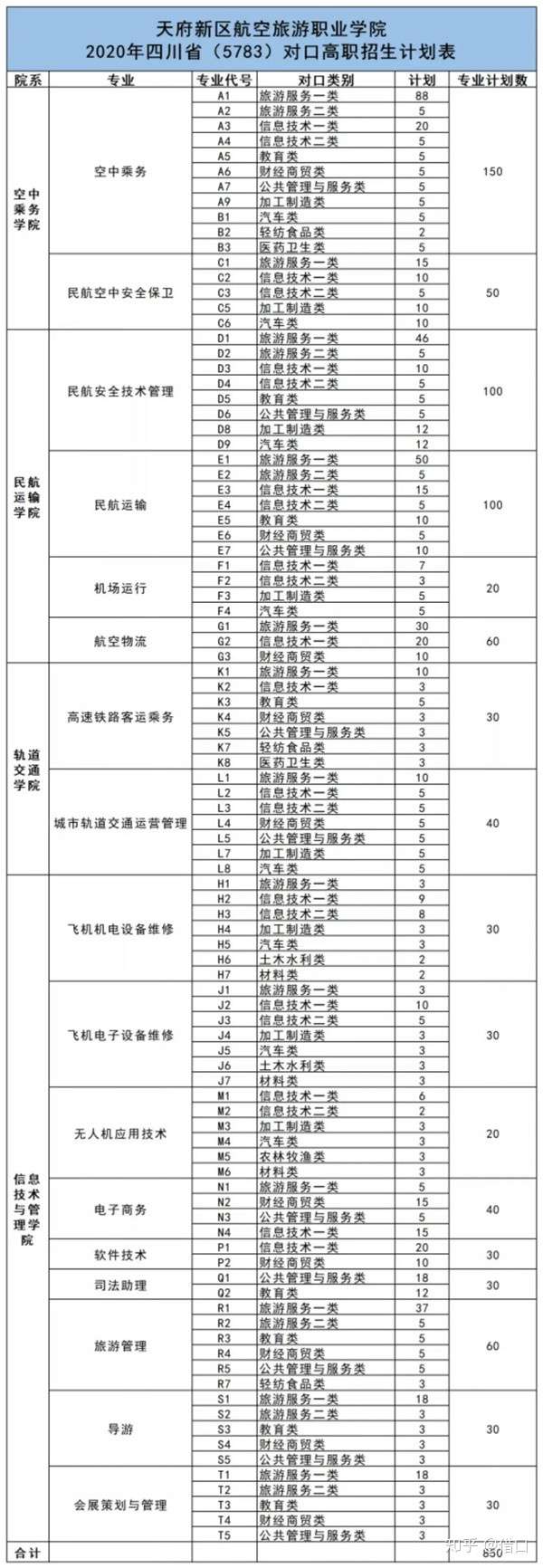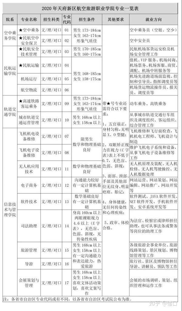 2020年天府新区航空旅游职业学校面向全国20个省市自治区,开设四个院系,十七个专业,招生计划总计1910人。