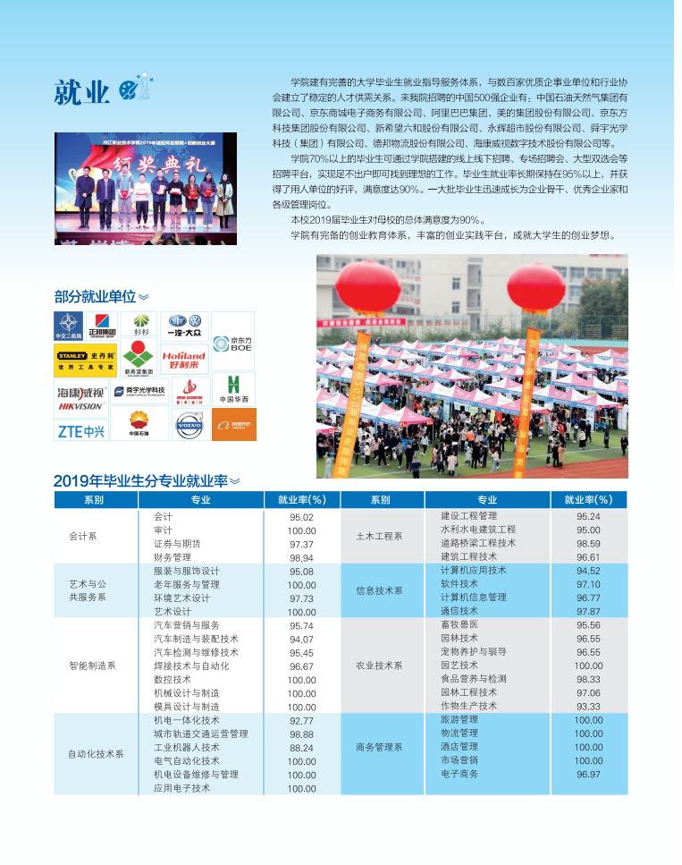 答:学校建有完善的大学毕业生就业指导服务体系,先后与500余家企事业单位和行业协会建立了稳定的人才供求关系,大多数毕业生可通过学校就业指导部门提供的各种专场招聘会实现就业。近5年毕业生就业率一直保持在96%以上。据第三方机构调查显示——2018届毕业生平均薪酬3947元,毕业生满意度达到90%。