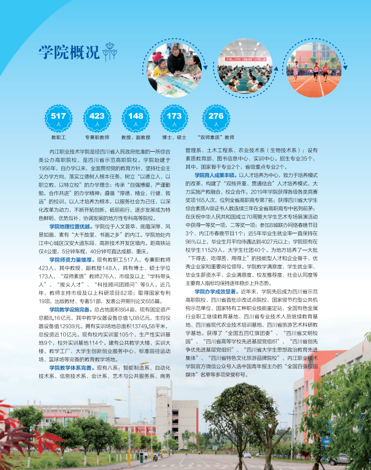 内江职业技术学校是经四川省人民政府批准的一所综合类公办高职院校,是四川省示范高职院校。学校始建于1956年,自办学以来,全面贯彻党的教育方针,坚持社会主义办学方向,落实立德树人根本任务,树立以德立人,以职立教,以特立校的办学理念;传承自强博爱,严谨勤勉,合作共进的办学精神;遵循厚德、精业、行健、致远的校训。以人才培养为根本,以服务社会为己任,以深化改革为动力,不断开拓创新,砥砺前行,逐步发展成为特色鲜明、优势互补、协调发展的地方性专科高等院校。