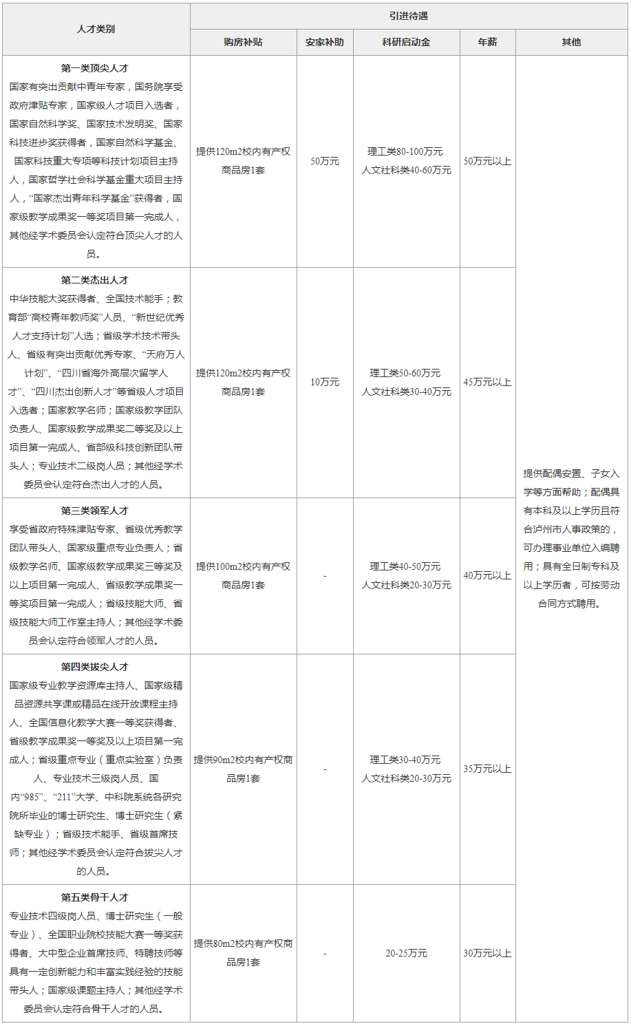 泸州职业技术学校2020-2021年高层次人才引进类别及待遇