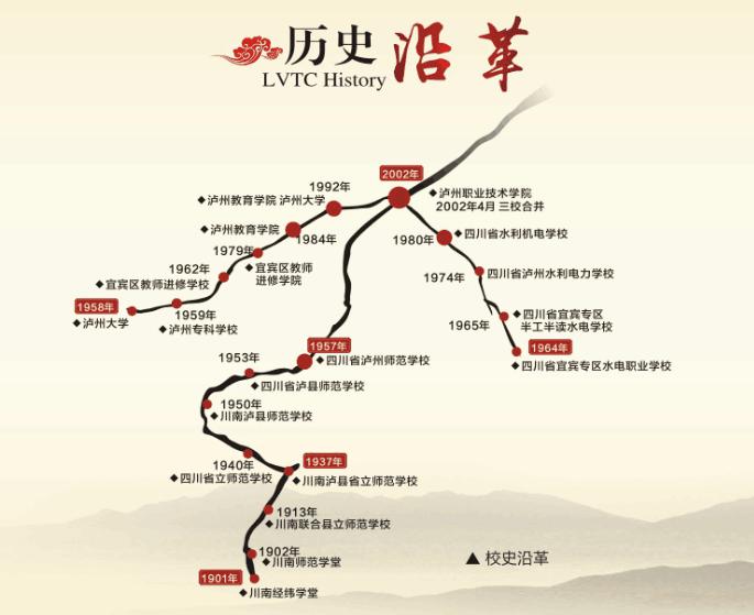 2002年4月,泸州教育学校、泸州师范学校和四川省水利机电学校合并组建泸州职业技术学校;于2002年9月26日正式挂牌成立。