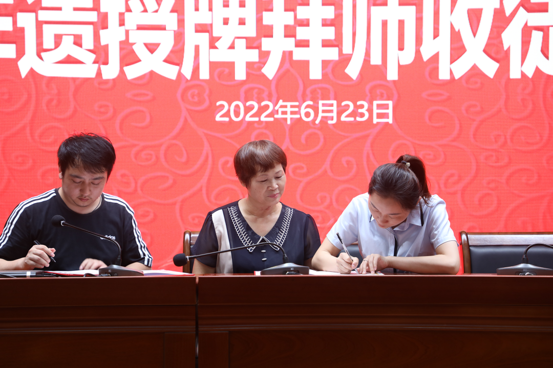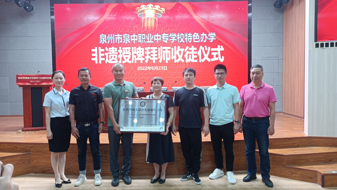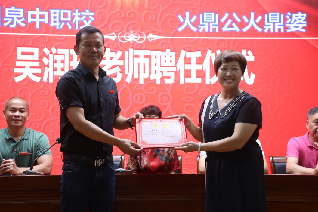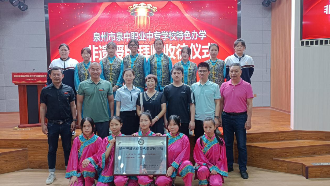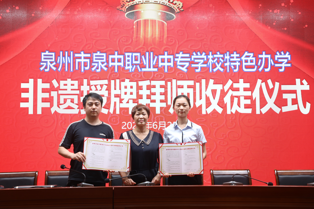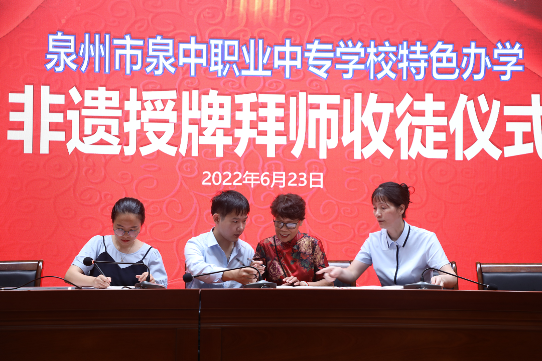 泉州鲤城火鼎公火鼎婆省级非遗传承人吴润珠老师与学校谢枚珍老师、廖威老师签署师徒协议