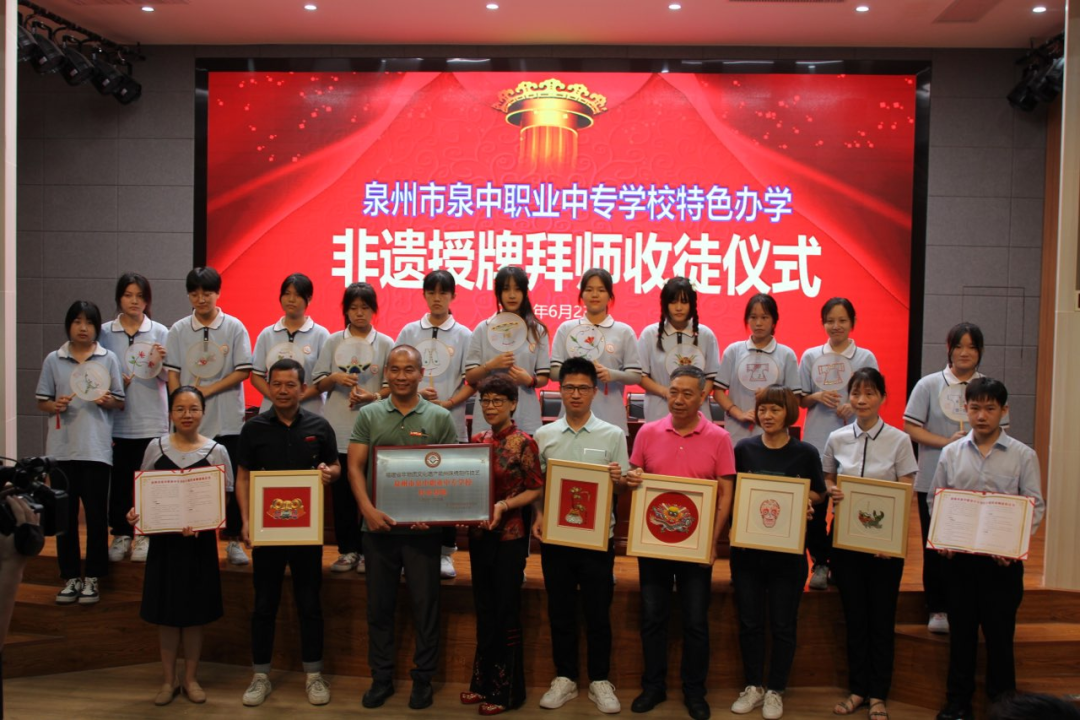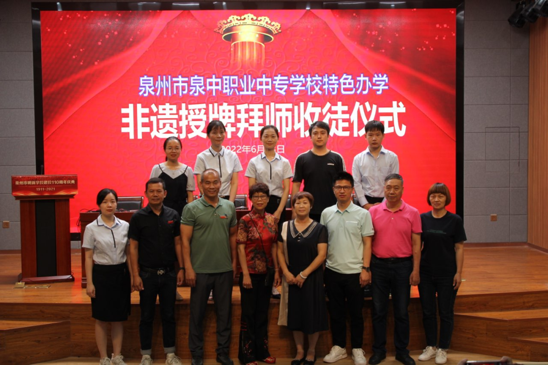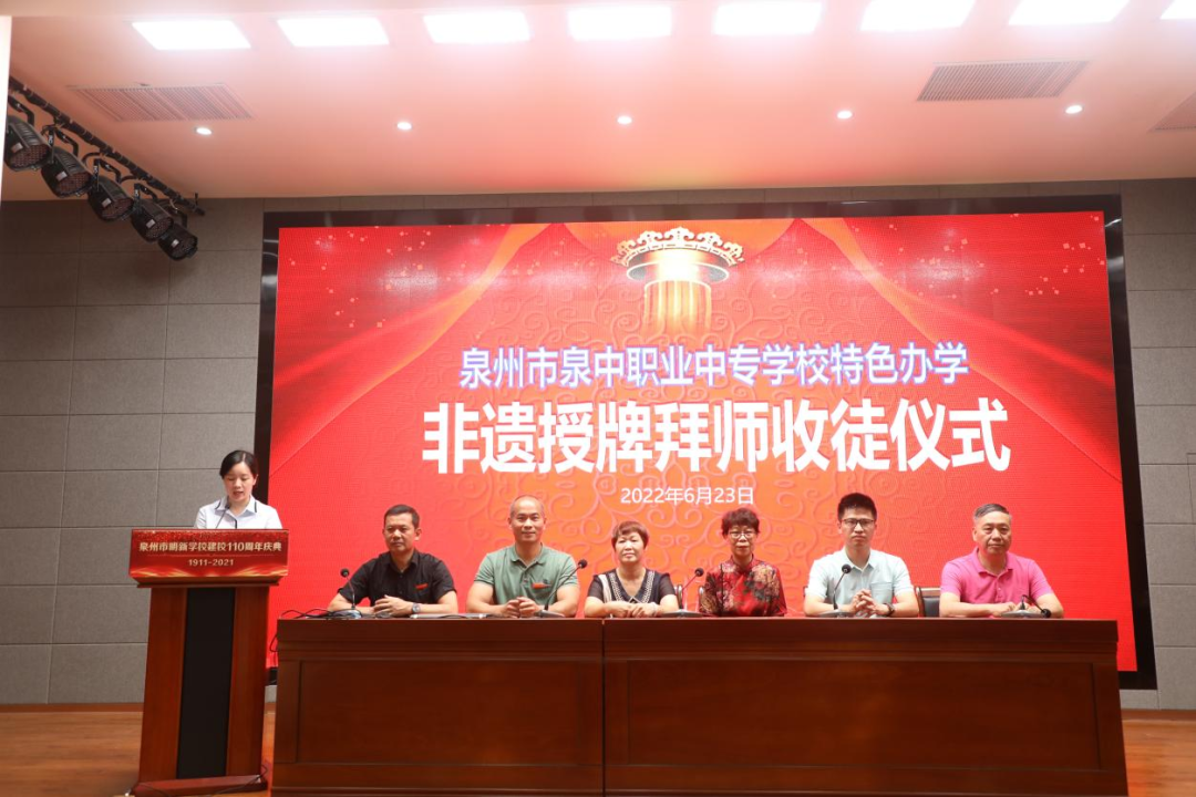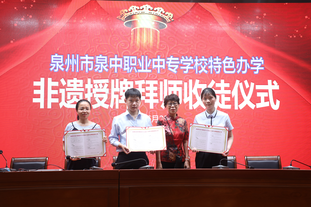 6月23日上午,泉州市泉中职业中专学校特色办学之非遗授牌拜师收徒仪式在学校学术报告厅隆重举行。福建省第四批非物质文化遗产保护项目《泉州鲤城火鼎公火鼎婆》代表性传承人吴润珠老师、泉州珠绣制作技艺代表性传承人陈克忍老师、泉州市泉中职业中专学校副书记副校长(主持工作)吴聪鹏、泉州市泉中职业中专学校副书记吴剑雄、泉州市泉中职业中专学校副校长张益煊等参加授牌拜师仪式。