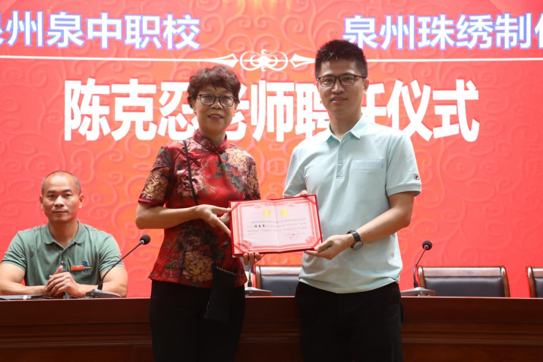 张益煊副校长为泉州珠绣制作技艺代表性传承人陈克忍老师颁发聘书