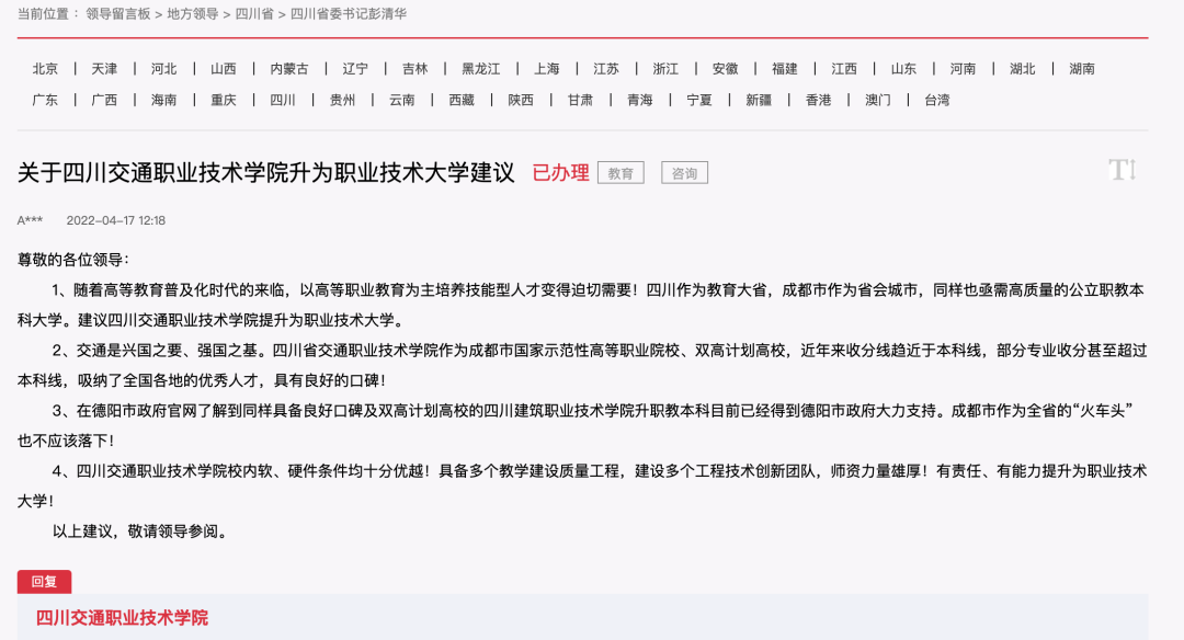 日前,有网友在人民网地方领导留言板上就四川交通职业技术学校升为职业技术大学提出建议,得到校方的官方回复。