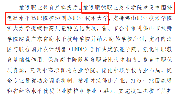 此前,在佛山市国民经济和社会发展第十四个五年规划和2035年远景目标纲要曾提出:推进顺德职业技术学校建设中国特色高水平高职院校和创办职业技术大学。