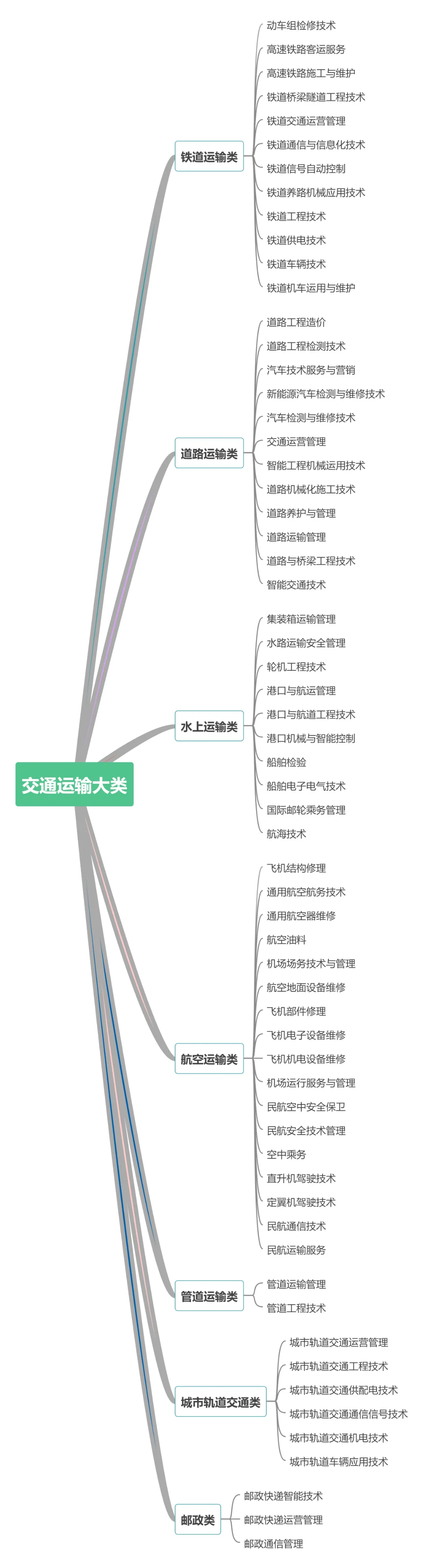 在本大类下共有铁道运输类、道路运输类、水上运输类、航空运输类、管道运输类、城市轨道交通类、邮政类7个专业类。