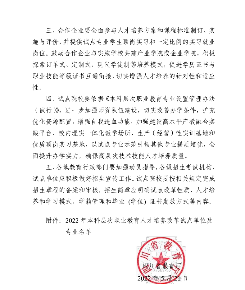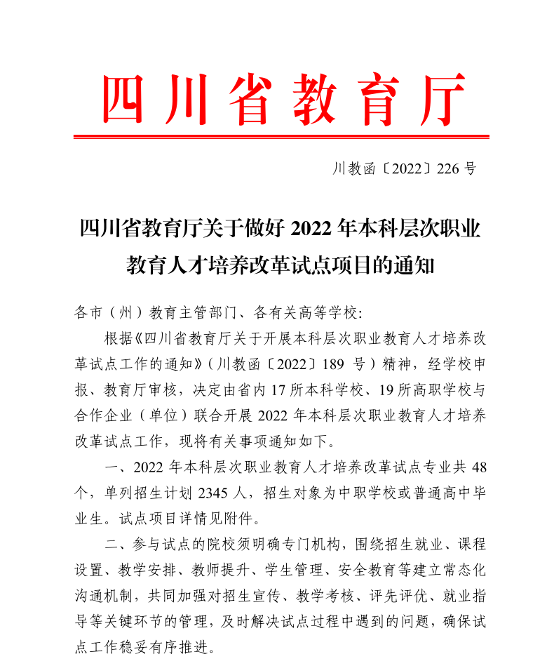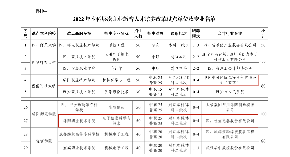 近日,根据《四川省教育厅关于做好2022年本科层次职业教育人才培养改革试点项目的通知》(川教函〔2022〕226号)精神,经学校申报、教育厅审核,决定由省内17所本科学校、19所高职学校与合作企业(单位)联合开展2022年本科层次职业教育人才培养改革试点工作。绵阳职业技术学校材料科学与工程专业和电子信息科学与技术专业纳入2022年本科层次职业教育人才培养改革试点项目。这为该校建设区域性一流职业大学奠定了坚实的基础。