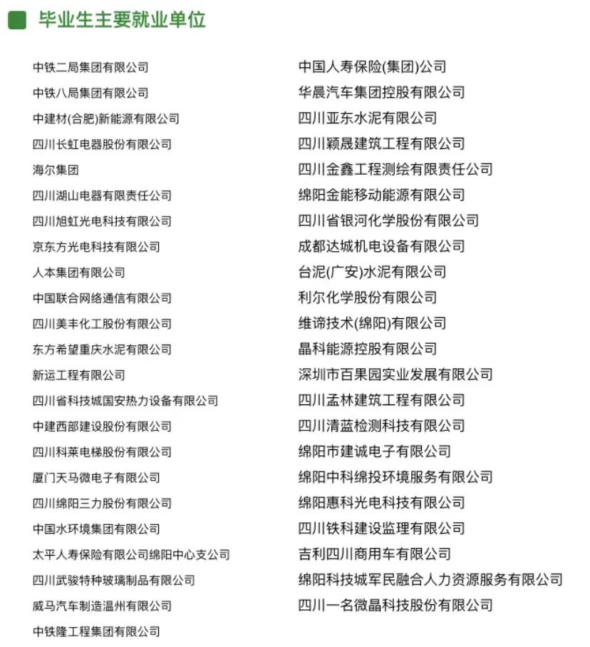学校积极发挥示范带动作用,构建了遍布全国的毕业生就业网络。毕业生就业领域主要包括新材料、电子信息、智能制造、财经商贸、文化旅游等优势行业,就业区域涵盖成渝双创经济圈等29个省市。