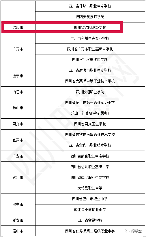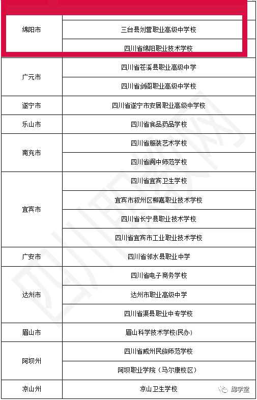 成都电子信息学校、四川省贸易学校、四川省商务学校(原四川省商业服务学校并入)、大竹县职业中学、成都市工程职业技术学校、四川省南充卫生学校、广元市利州中等专业学校、乐山市计算机学校、四川省绵阳财经学校、攀枝花市经贸旅游学校、中国十九冶高级技工学校、四川省乐至县高级职业中学、四川省泸县建筑职业中专学校、四川省武胜职业中专学校、四川省成都市中和职业中学、凉山州职业技术学校、四川机电高级技工学校、巴中市职业中学、成都市现代职业技术学校