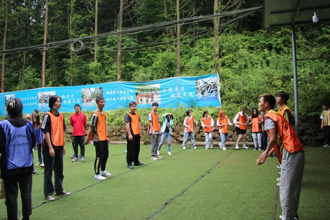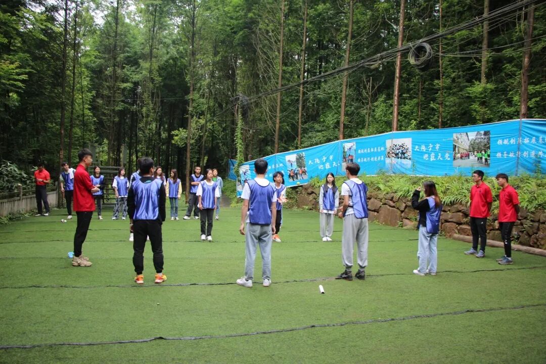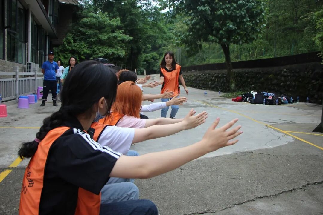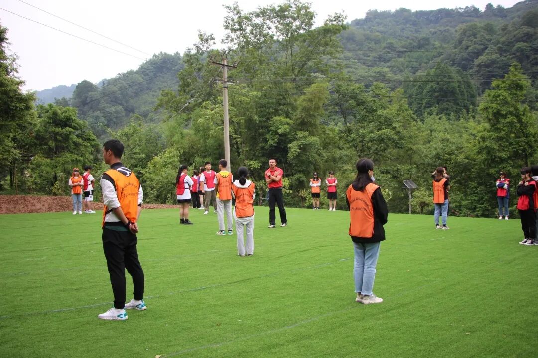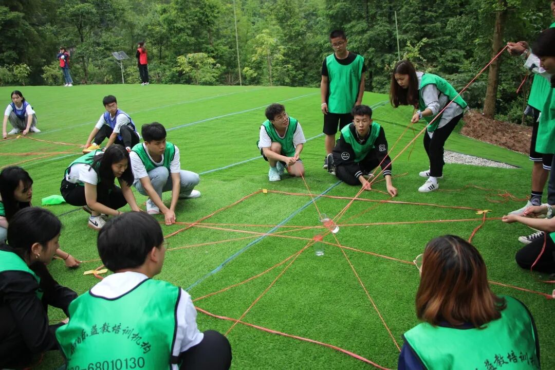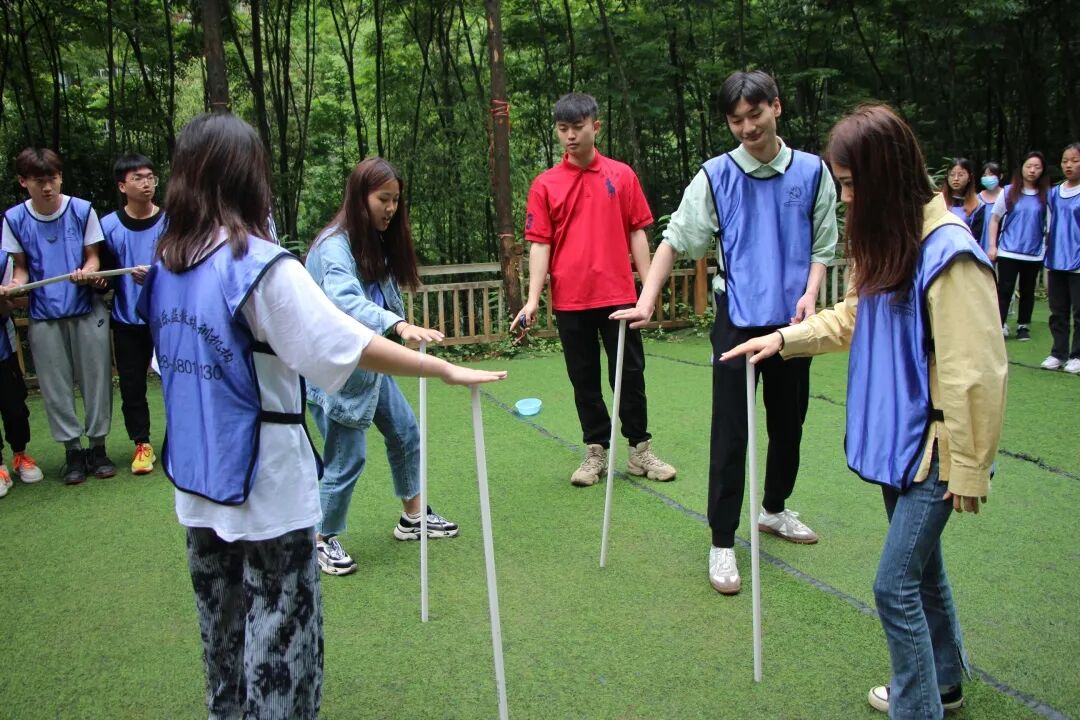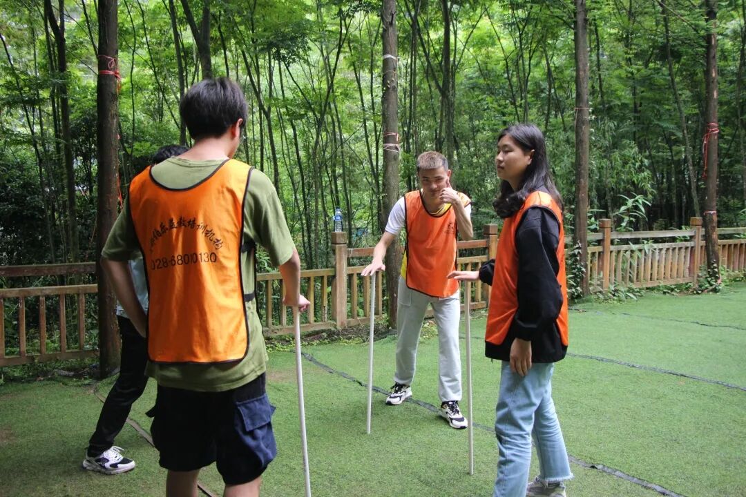 不倒森林:学生4人一组,要求每个人手拿一根1.2m的塑料杆围成一个圆,用右手掌心抵住塑料杆一头,将塑料杆立在地上,在塑料杆不倒的情况下迅速向前移动,并用手抵住前面队友的塑料杆,在交接中杆子不能落地,如果落地就必须重新开始。每个人转了一圈后再次回到原位,游戏才算过关。这个游戏看似非常的简单,但是实际操作起来确是非常的不容易的,能培养团结互助,和人员的专注能力。