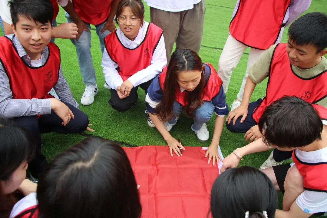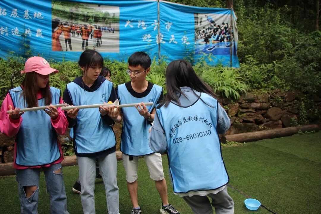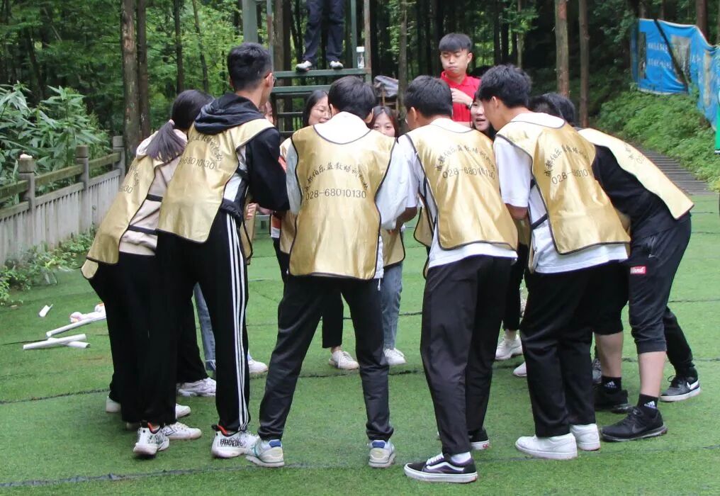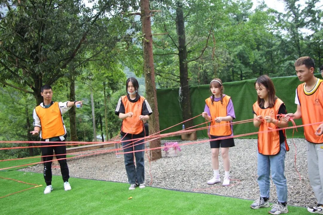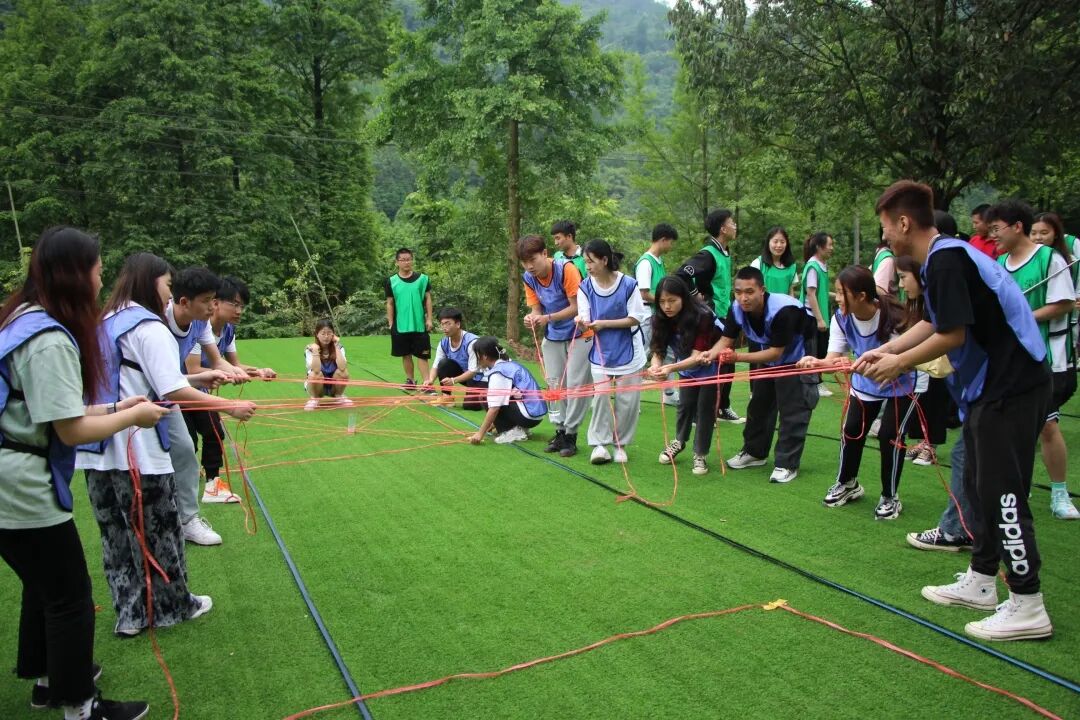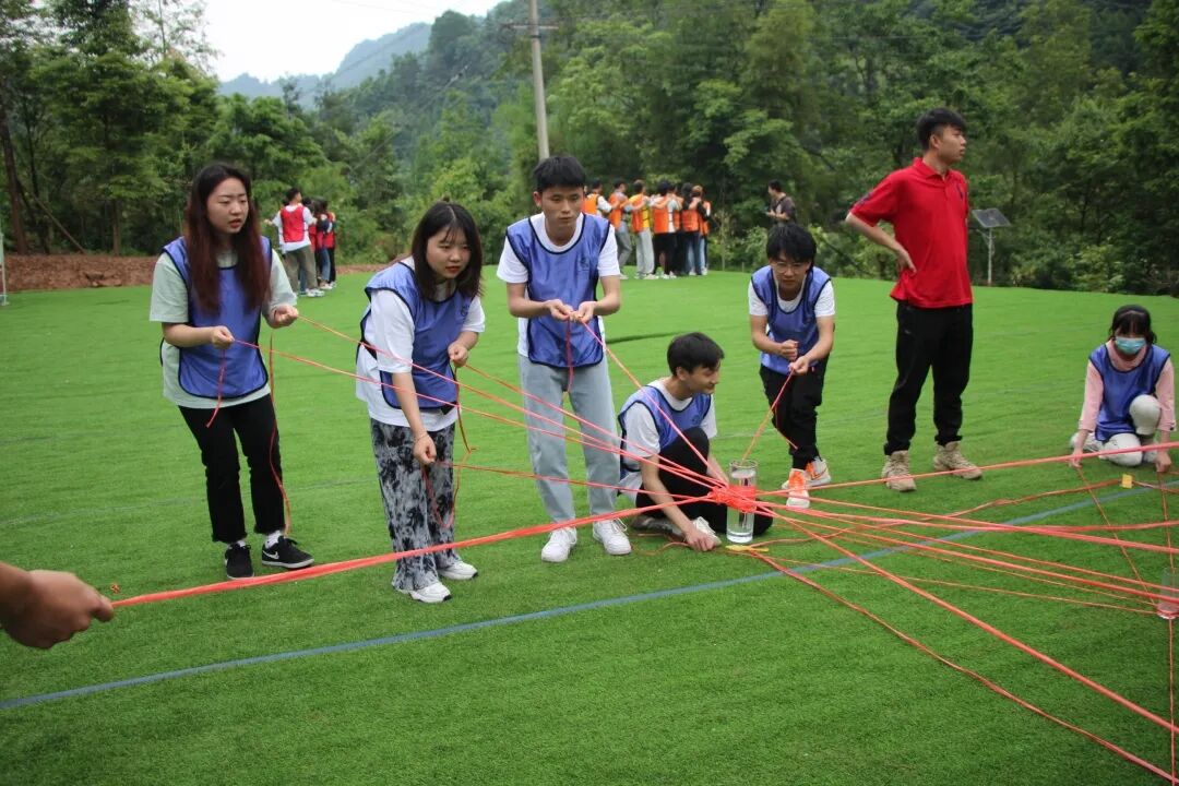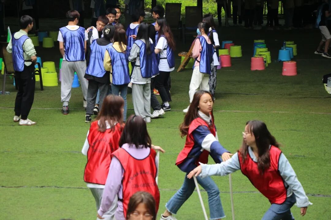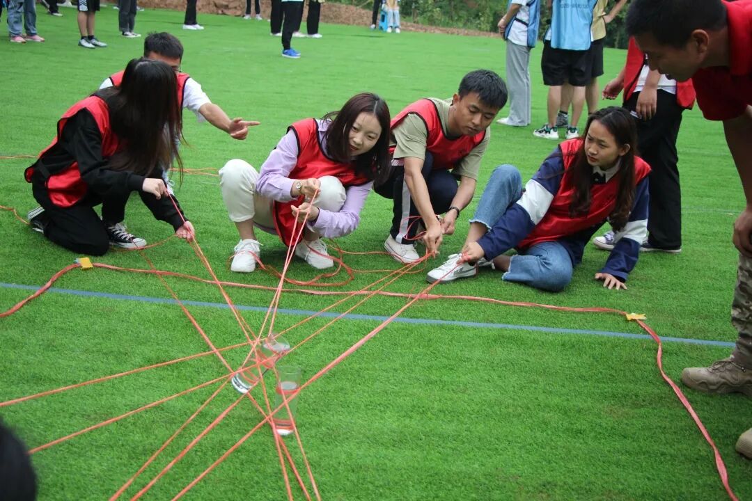 不倒森林:学生4人一组,要求每个人手拿一根1.2m的塑料杆围成一个圆,用右手掌心抵住塑料杆一头,将塑料杆立在地上,在塑料杆不倒的情况下迅速向前移动,并用手抵住前面队友的塑料杆,在交接中杆子不能落地,如果落地就必须重新开始。每个人转了一圈后再次回到原位,游戏才算过关。这个游戏看似非常的简单,但是实际操作起来确是非常的不容易的,能培养团结互助,和人员的专注能力。