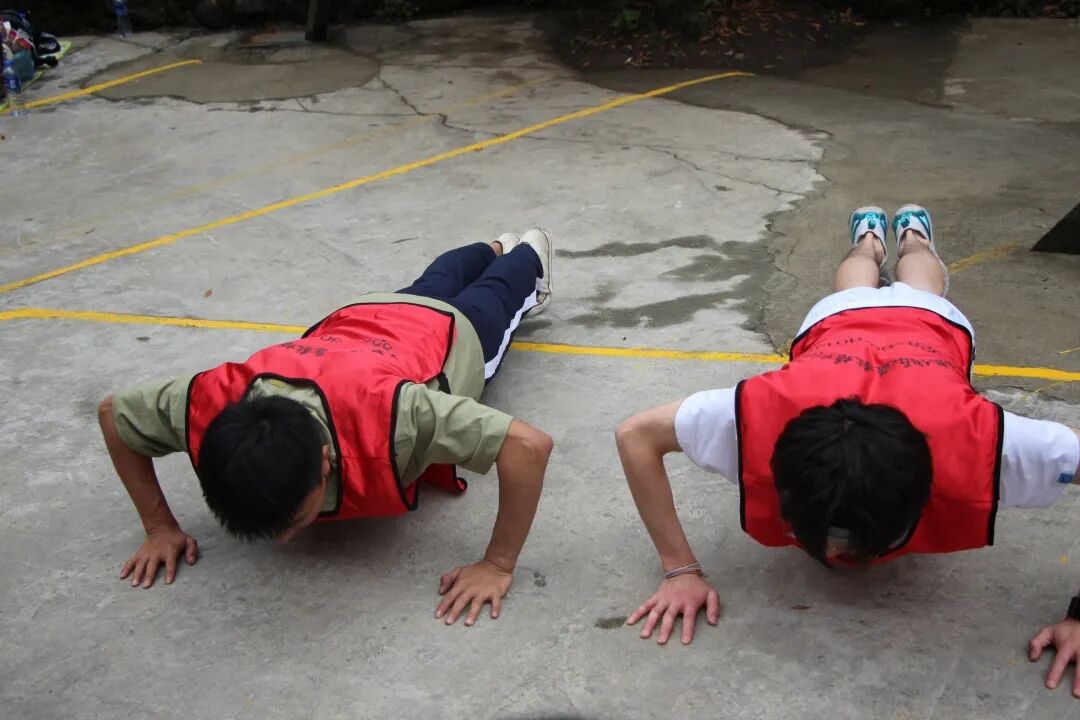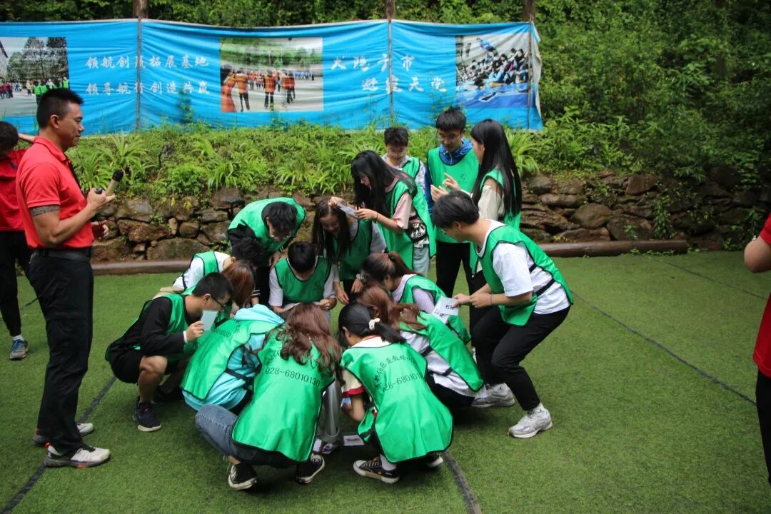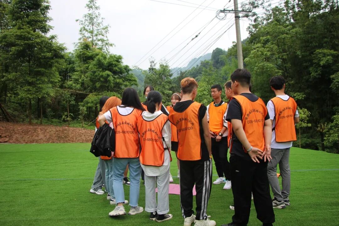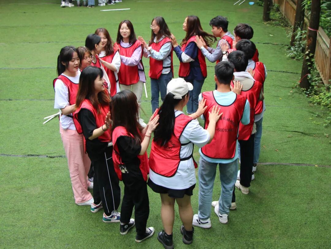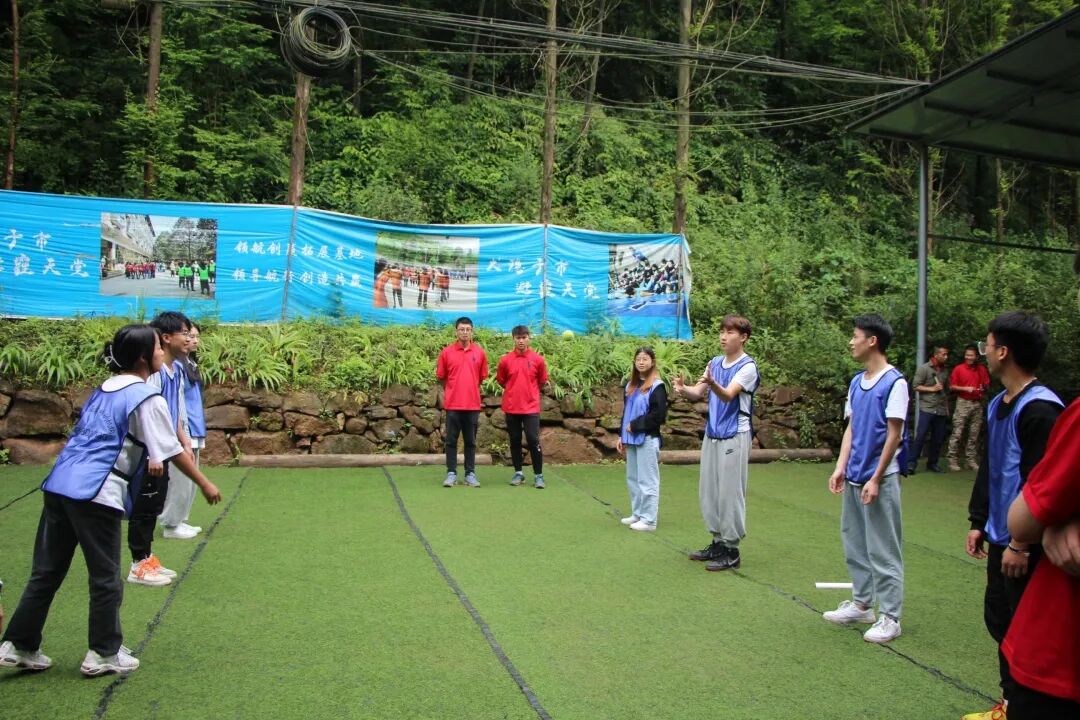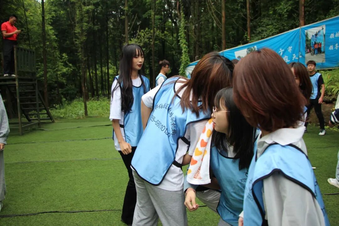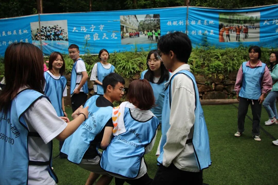 不倒森林:学生4人一组,要求每个人手拿一根1.2m的塑料杆围成一个圆,用右手掌心抵住塑料杆一头,将塑料杆立在地上,在塑料杆不倒的情况下迅速向前移动,并用手抵住前面队友的塑料杆,在交接中杆子不能落地,如果落地就必须重新开始。每个人转了一圈后再次回到原位,游戏才算过关。这个游戏看似非常的简单,但是实际操作起来确是非常的不容易的,能培养团结互助,和人员的专注能力。