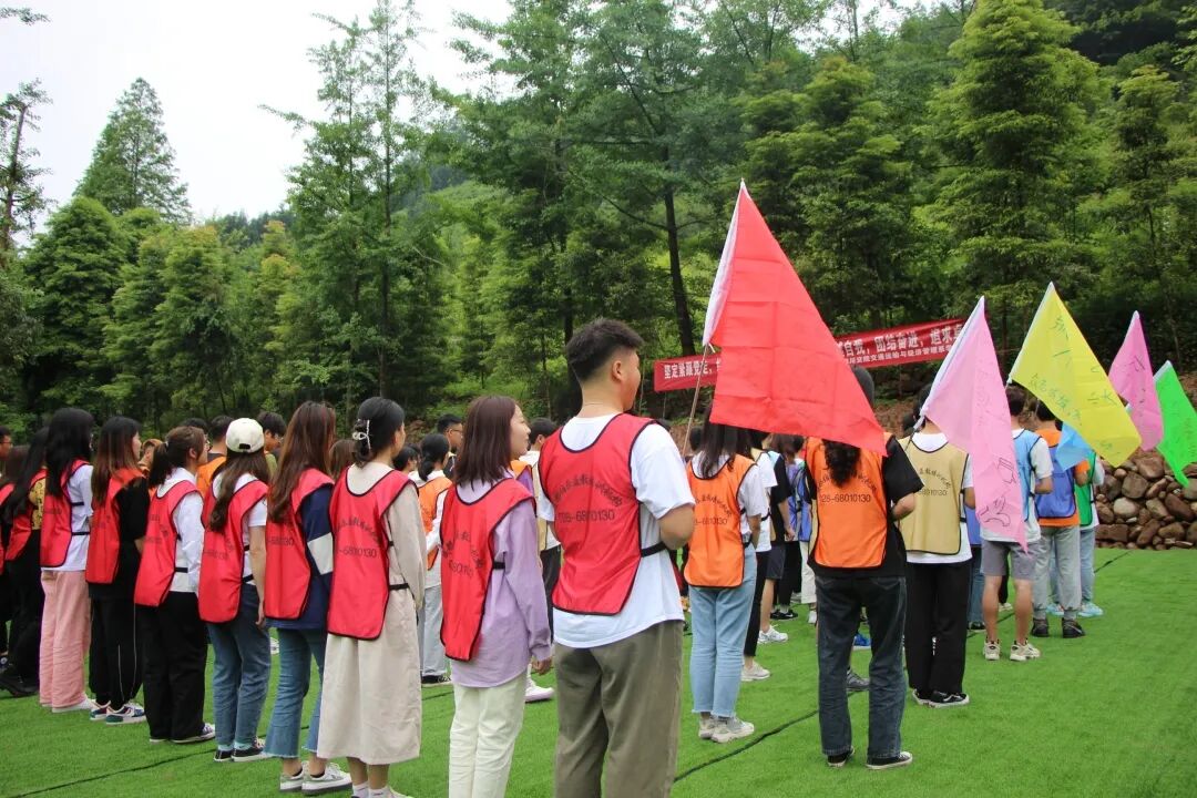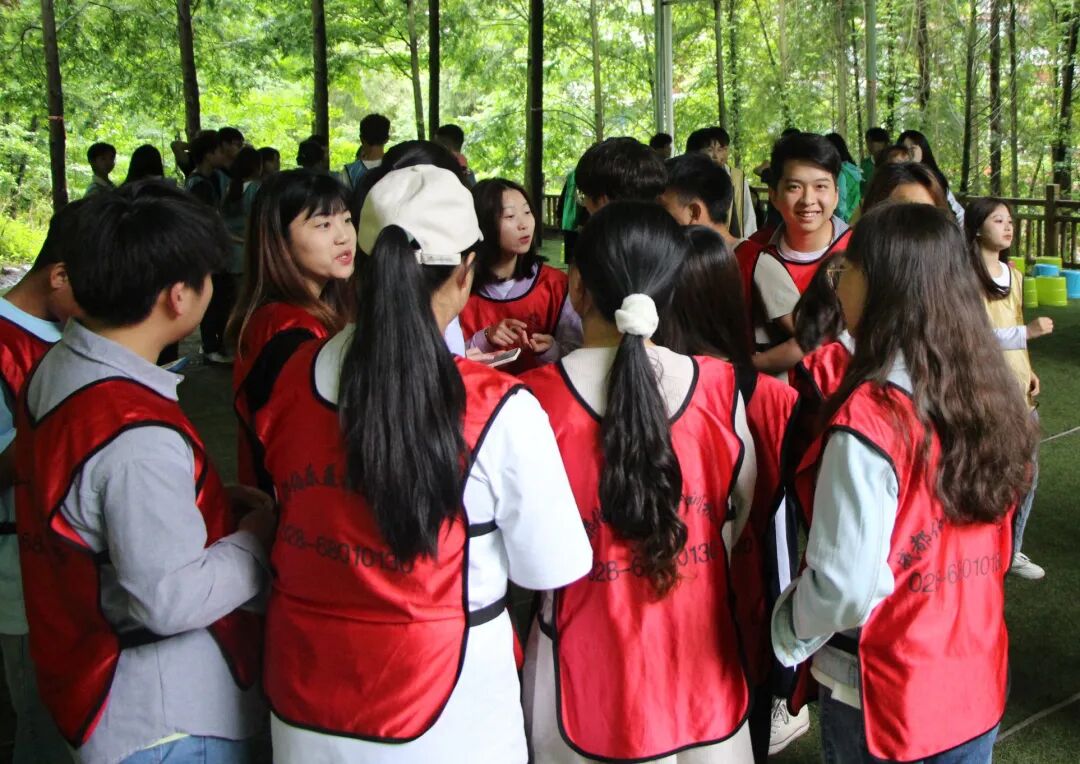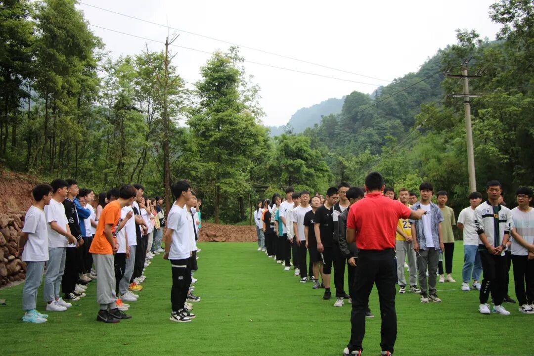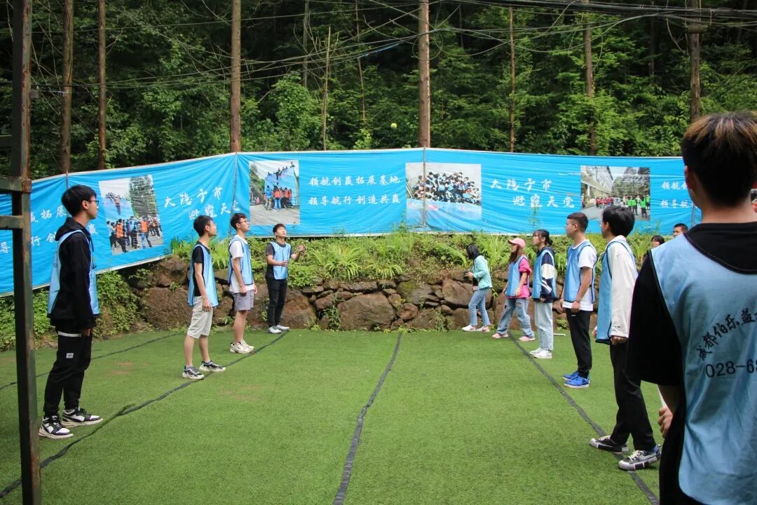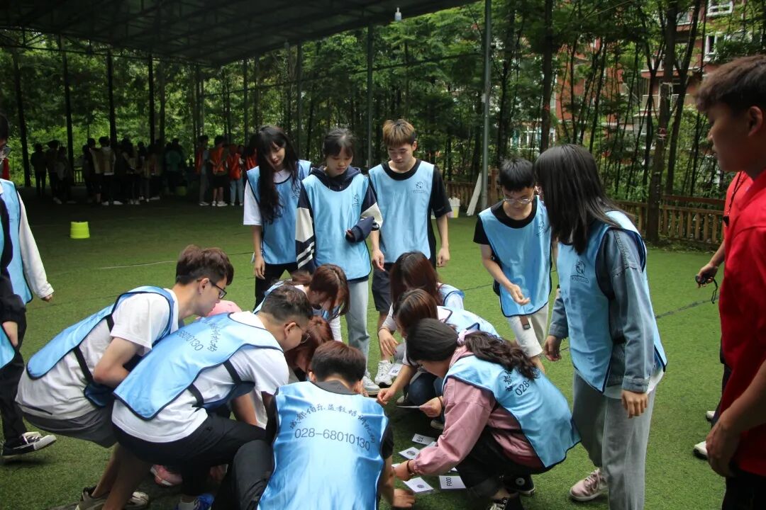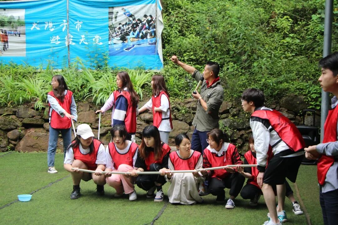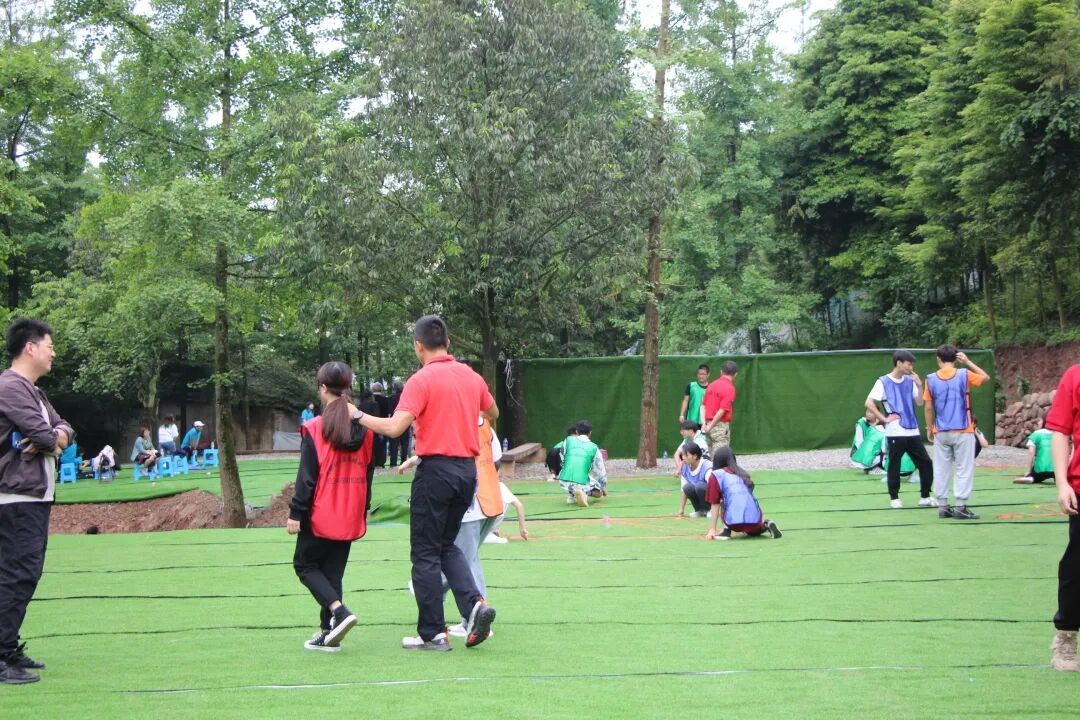 不倒森林:学生4人一组,要求每个人手拿一根1.2m的塑料杆围成一个圆,用右手掌心抵住塑料杆一头,将塑料杆立在地上,在塑料杆不倒的情况下迅速向前移动,并用手抵住前面队友的塑料杆,在交接中杆子不能落地,如果落地就必须重新开始。每个人转了一圈后再次回到原位,游戏才算过关。这个游戏看似非常的简单,但是实际操作起来确是非常的不容易的,能培养团结互助,和人员的专注能力。