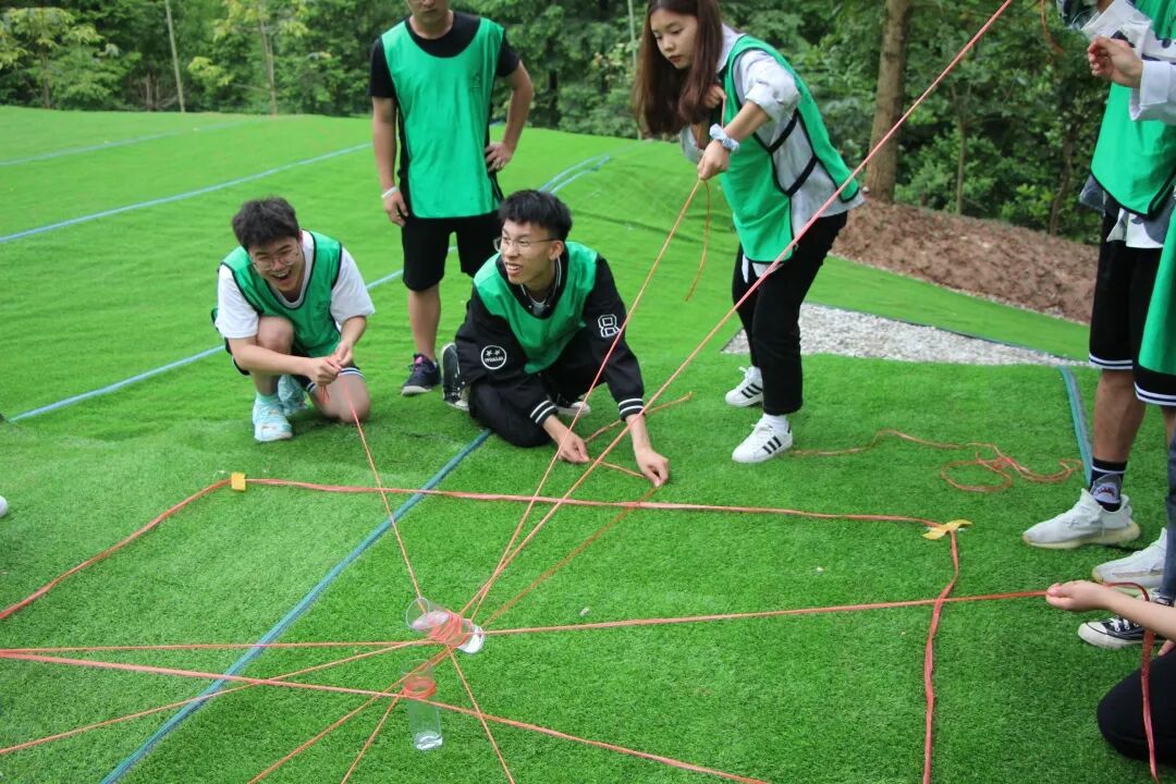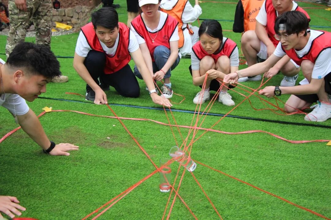 在规定时间(40分钟)内,依靠团队的协作和智慧用几根绳子将在雷区内(边长2米的矩形地面中间)的液态炸弹(装满水的杯子)排除,并将液体安全移送到雷区外的弹药库(另一个边长2米的矩形地面中间)。