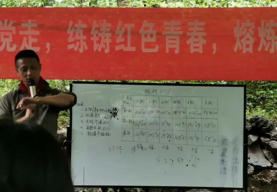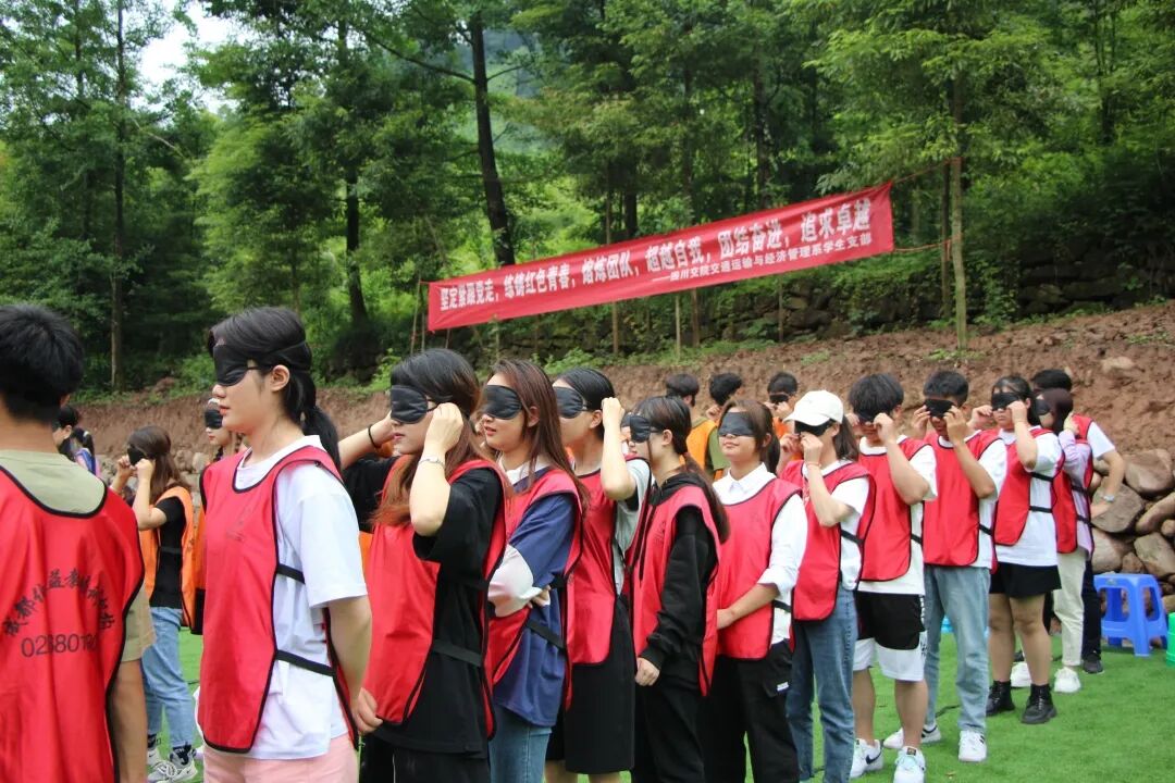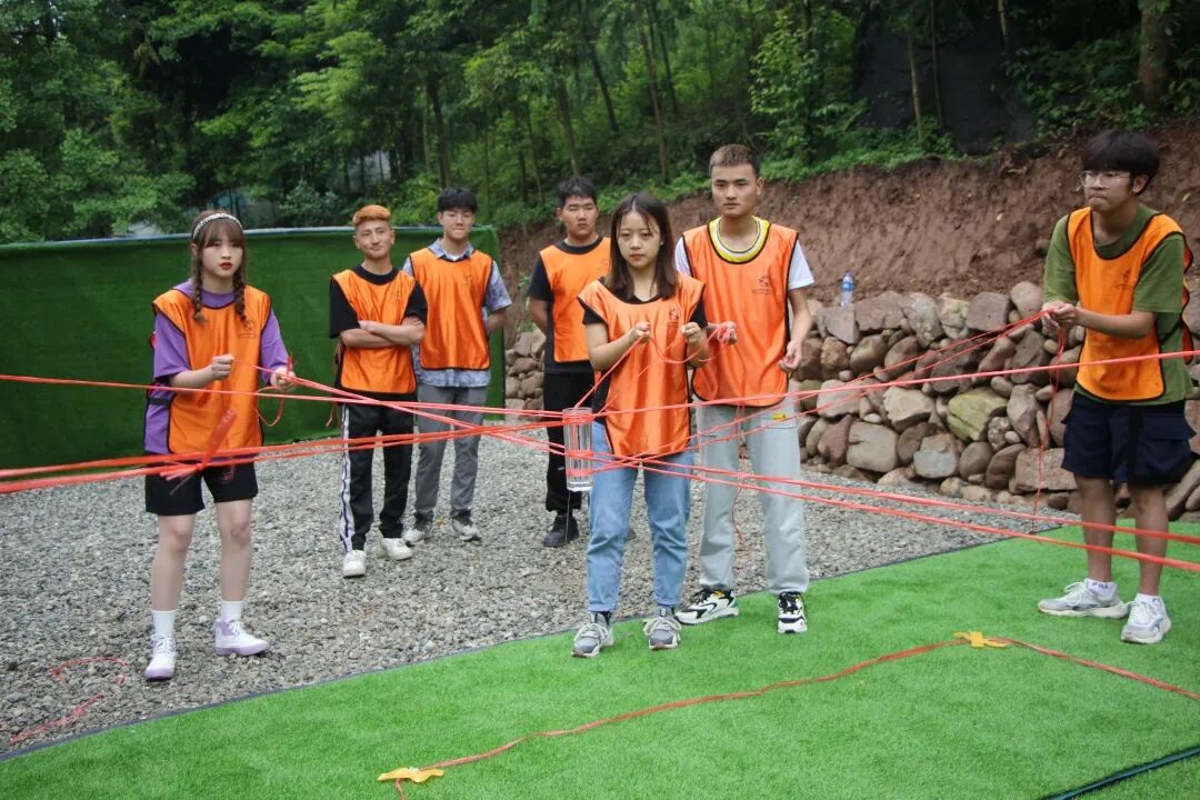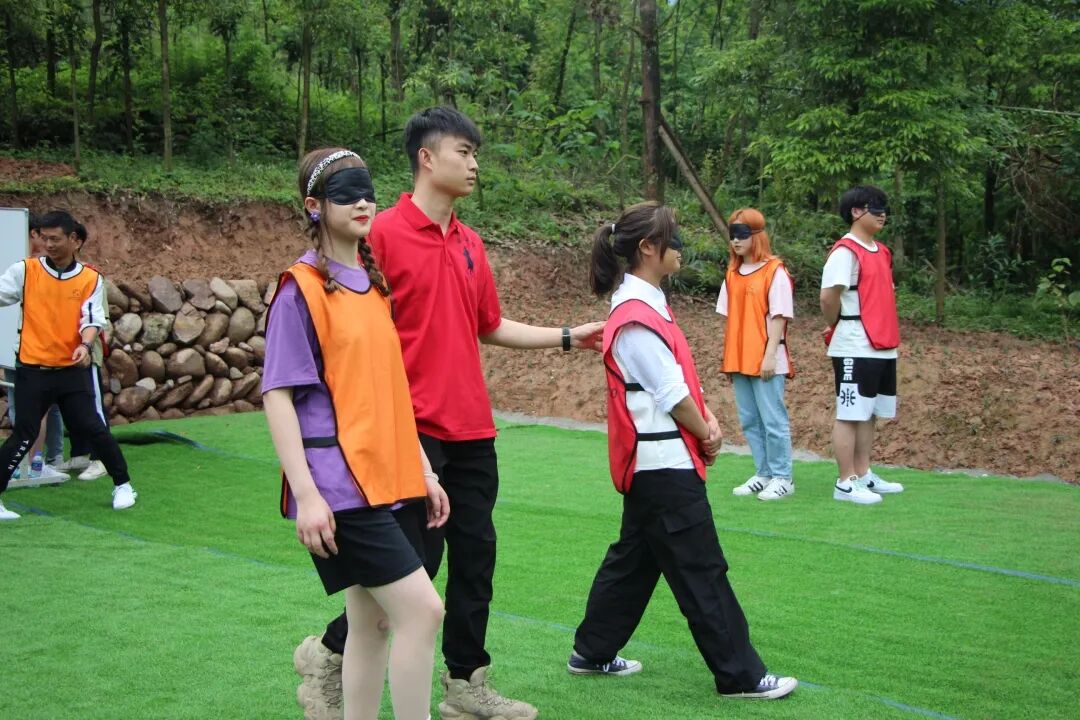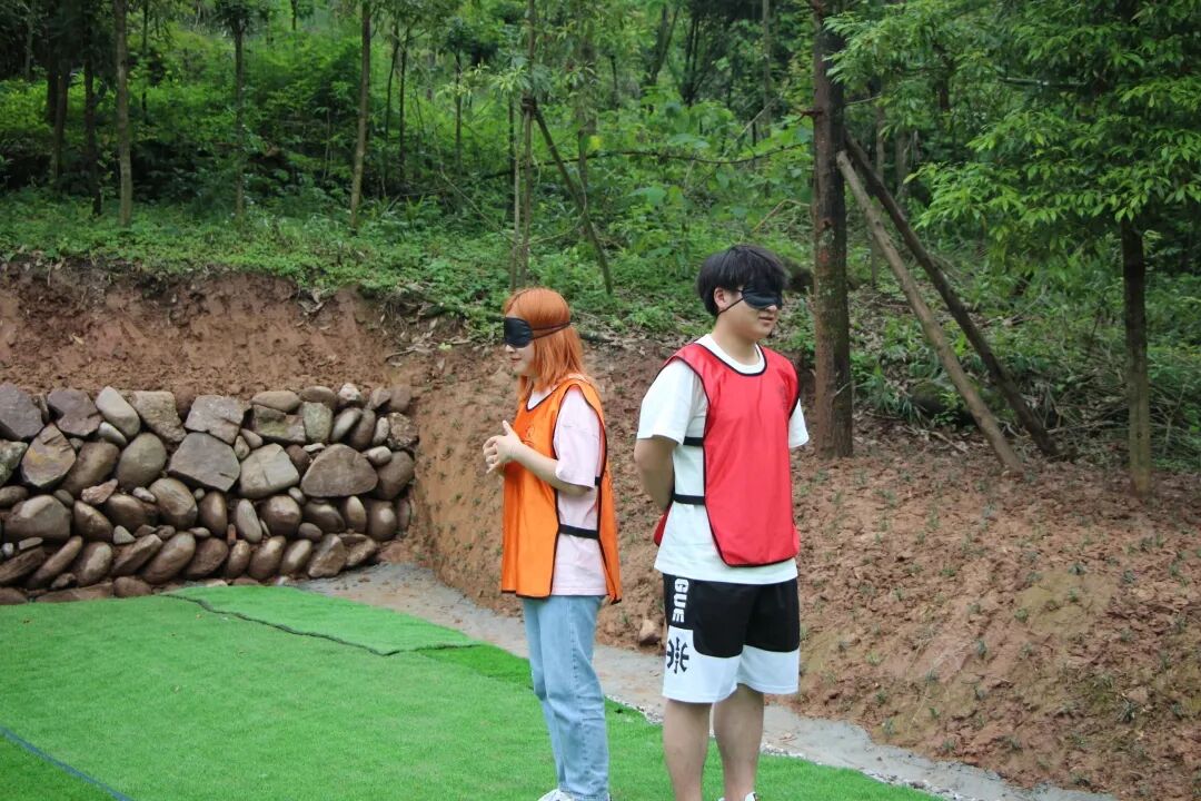 小队除一名队员外,其他所有队员佩戴眼罩。在没有佩戴眼罩队员非语言指挥的情况下,小队全员需要走过一段路程,越过一些障碍,到达指定地点获取指定物品。