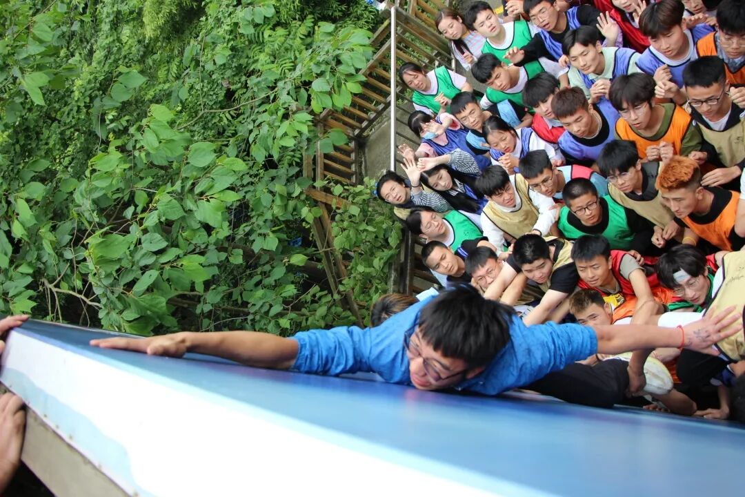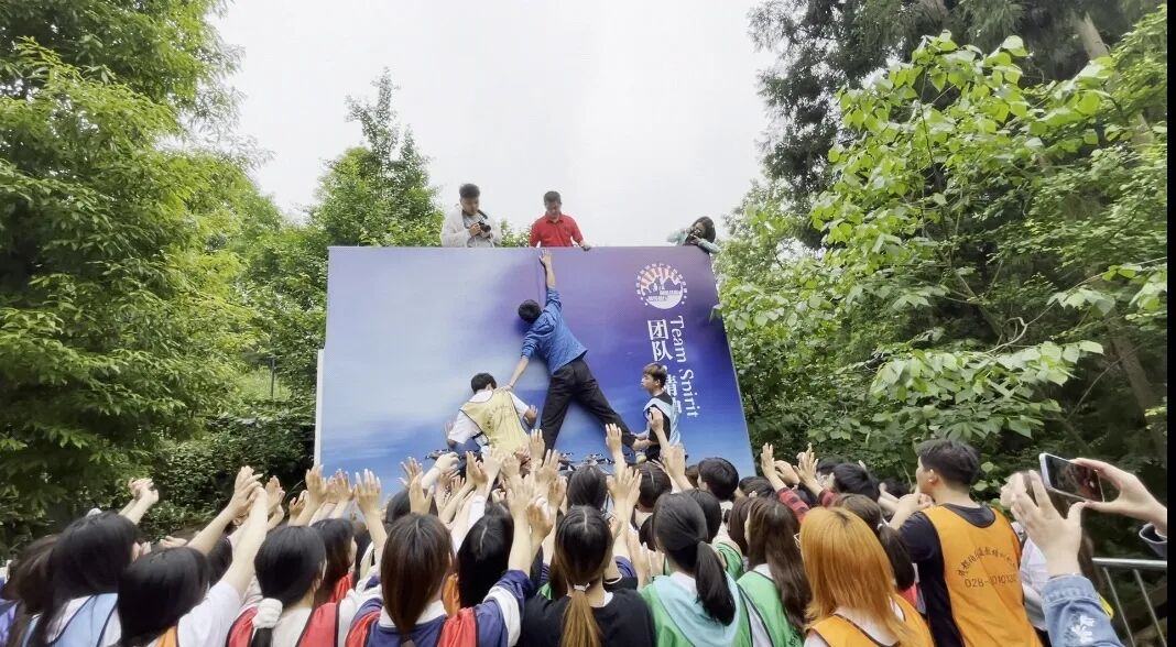 毕业墙是为让参训学员明白个人与团队的关系,团队获取成功才是真正的成功。团队成员要在50分钟内全体翻过一面高4米的垂直墙面,活动过程中,不可以借助任何身体以外的工具,包括但不限于:衣服、皮带、绳索、毛巾等。所能用并且允许用的只有每个学员的身体。