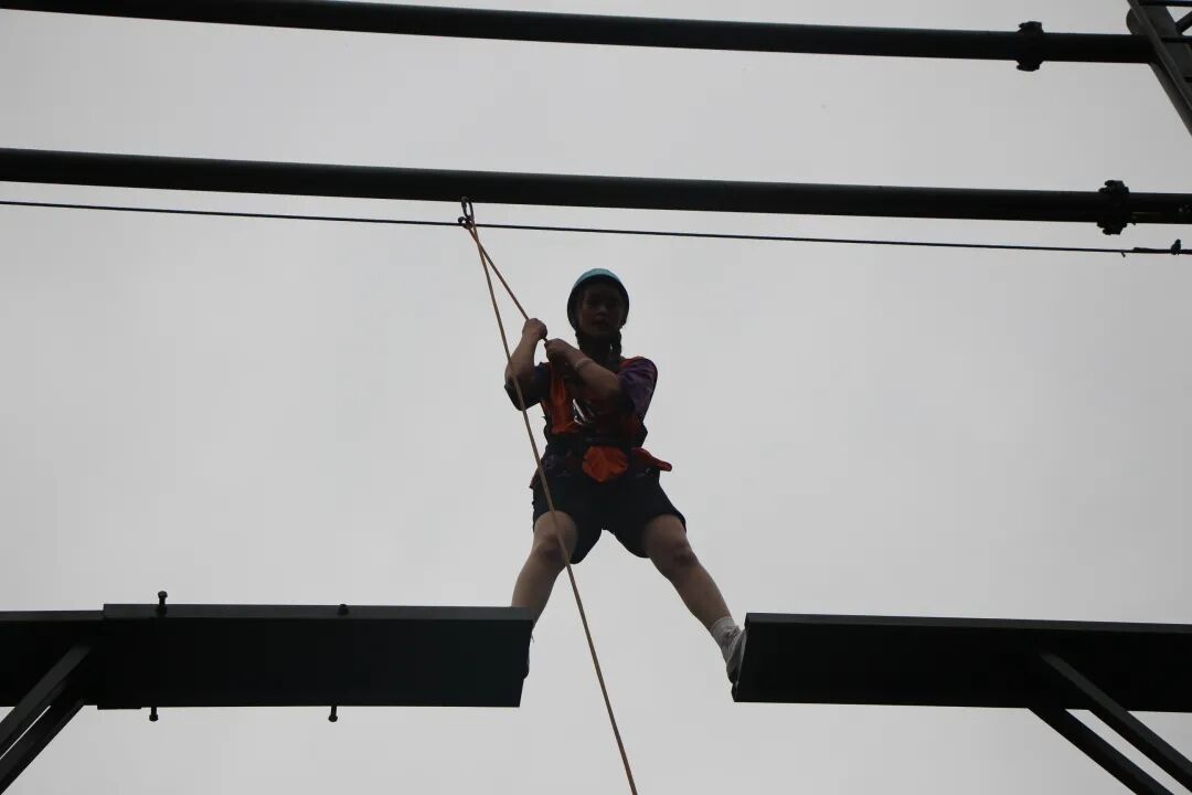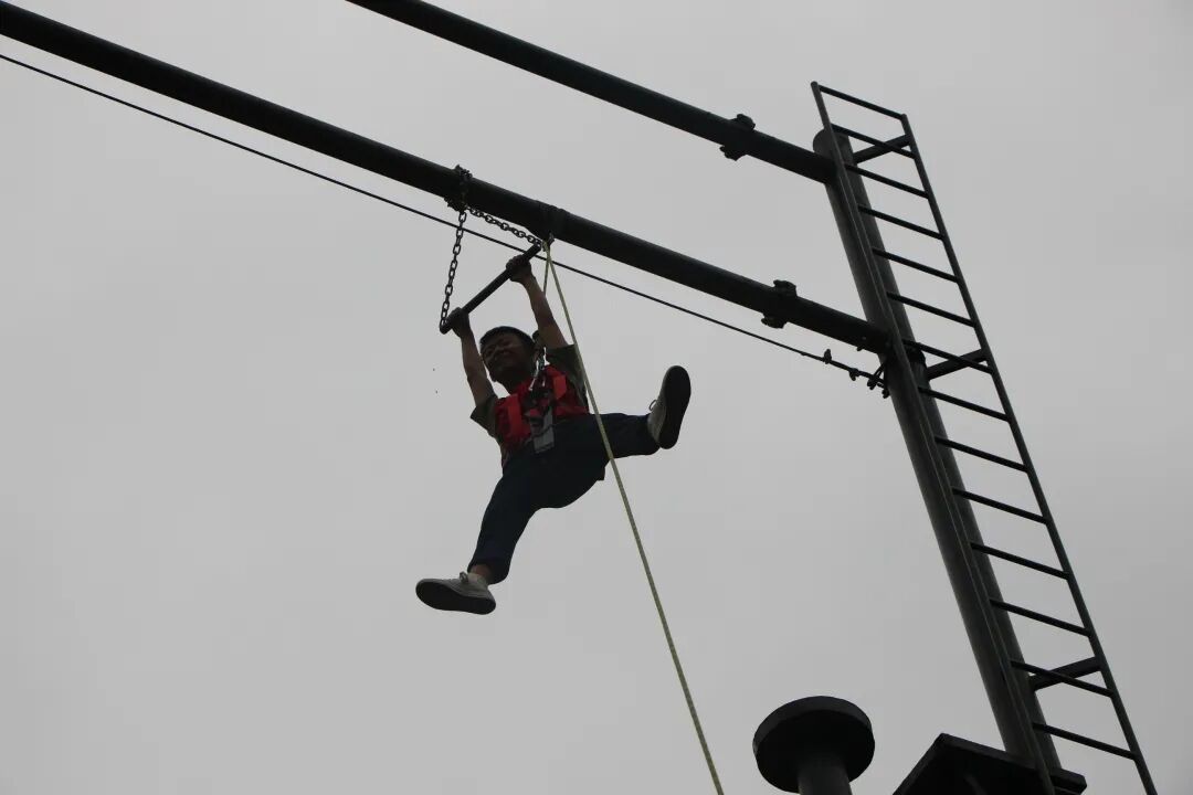 空中抓杠是一个以自我挑战为主的项目。要求每一位队员都独立爬上9米高的高台,并在直径仅为25公分的圆盘上站立,然后从圆盘上奋力跃出,去抓住横在空中的单杠。