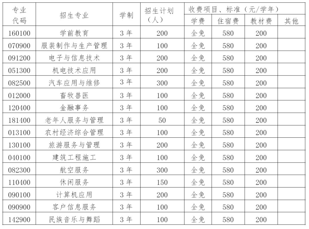 备注:学前教育、电子与信息技术、机电技术应用、畜牧兽医专业为国家示范建设重点专业,农村经济综合管理为省级示范专业,服装制作与生产管理为市级重点专业。