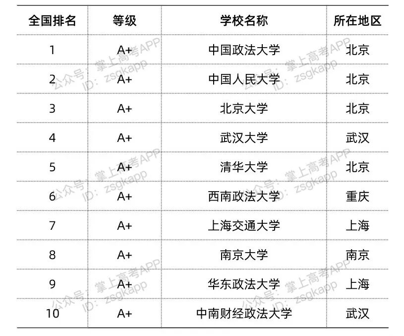 在2021年软科中国大学专业排名榜单中,共有314所院校的法学专业上榜。Top 10 院校排名如下: