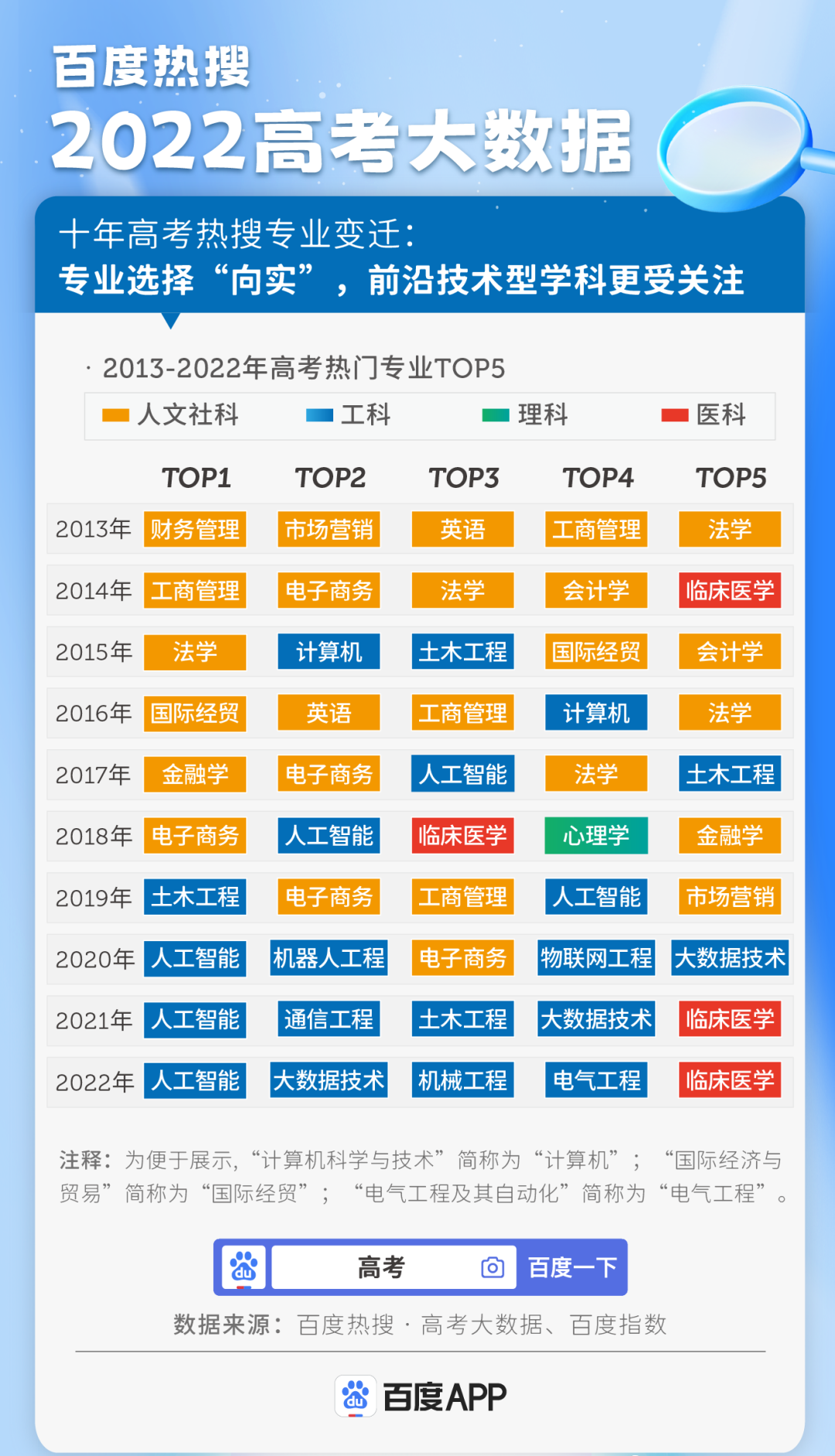 纵观高考热门专业十年变迁,大数据显示,和往年人文社科类专业热度靠前的情况相比,近两年,人工智能、机器人工程、大数据技术等前沿技术型学科已牢牢占据热榜前位。随着全民对公共卫生与健康的关注提升,临床医学专业也在近两年入榜热门专业前五。