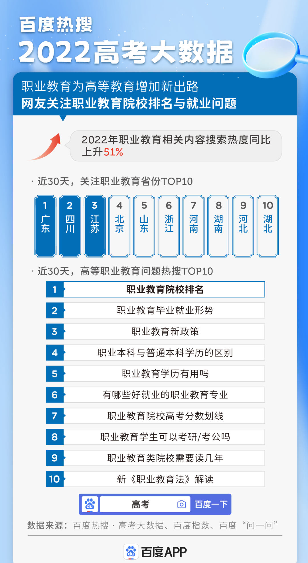 随着各地相继推动职业教育的创新发展,2022年,职业教育相关内容搜索热度已经同比上升51%。包括广东、四川、江苏等地区的考生家庭,对职业教育具有浓厚兴趣。在考生家庭的搜索关注中,人们普遍关心职业教育的院校排名与毕业就业形势。在多元化的从业路径中,职业教育有望成为广受认可的出路选择。