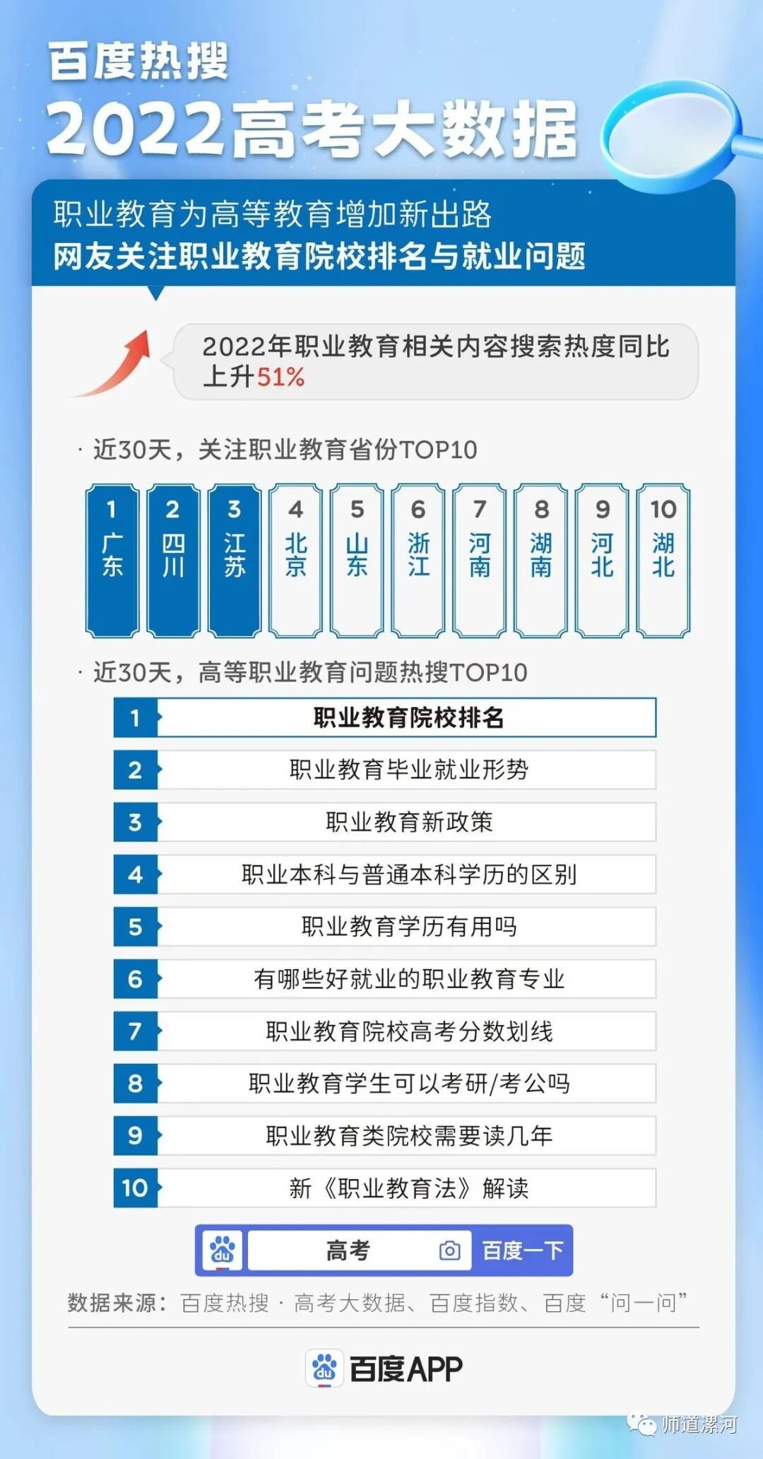随着各地相继推动职业教育的创新发展,2022年,职业教育相关内容搜索热度已经同比上升51%。包括广东、四川、江苏等地区的考生家庭,对职业教育具有浓厚兴趣。在考生家庭的搜索关注中,人们普遍关心职业教育的院校排名与毕业就业形势。在多元化的从业路径中,职业教育有望成为广受认可的出路选择。