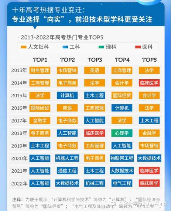 (图注:十年高考热搜专业变迁)从这份热搜专业的数据变迁中可以我们可以看出,2013年到2016年间,直接与金融商贸相关的财务管理、国际经贸、金融学等专业最为吃香,不仅排名第一,还占据了热搜专业的大半江山。在2013年到2016年这段时间中,社会对于工科的了解尚少,孩子如说起想学工科,计算机便是第一选择,但对于这个发展方向宽广的专业来说,人们的了解尚欠缺。