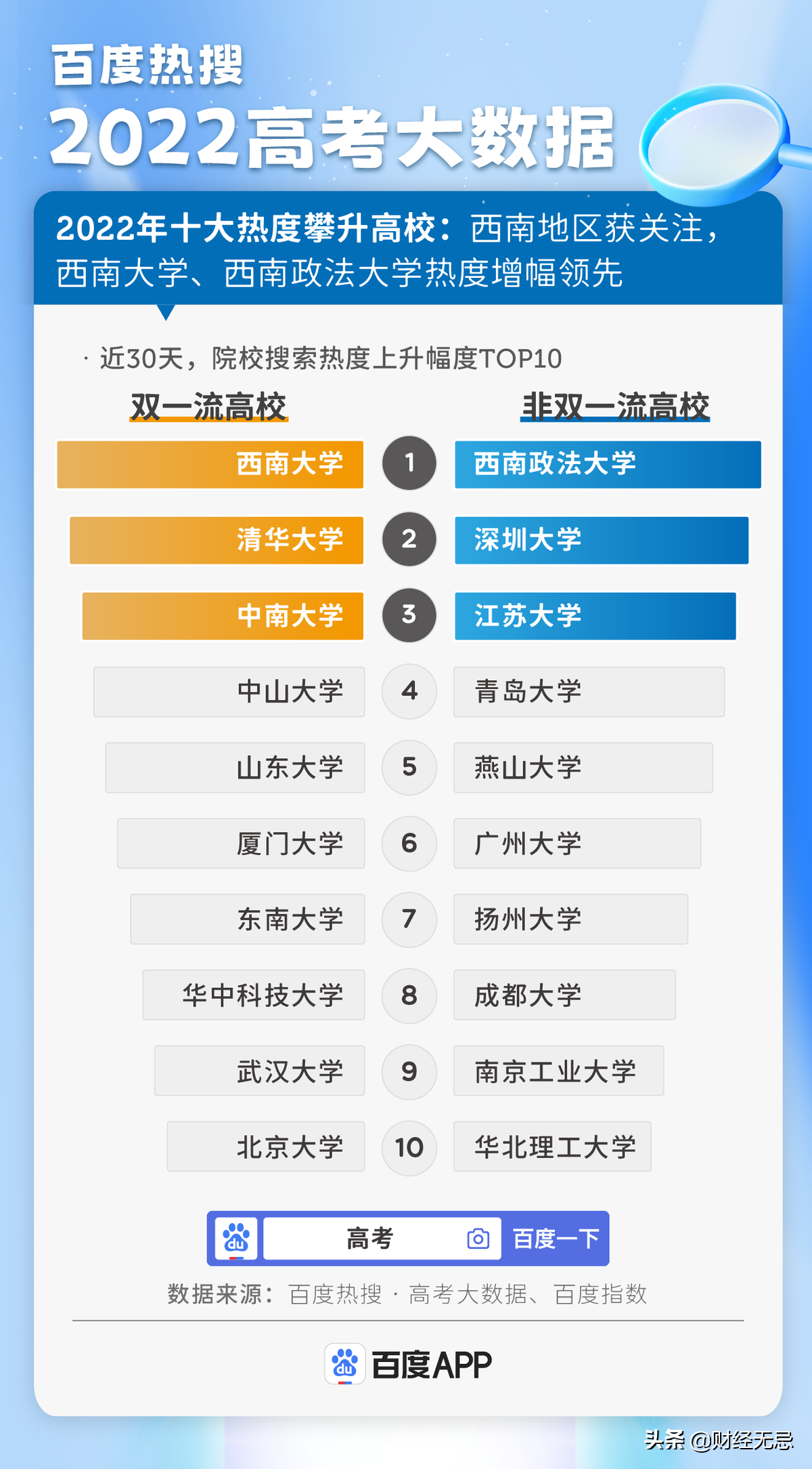 院校选择上,百度热搜大数据进一步整理了2022年十大热度攀升高校。其中,西南地区高校广受关注:学科齐全、实力强劲的西南大学,热度增幅位列双一流院校类榜首,西南政法大学,也在非双一流院校中的搜索热度增幅中位列第一。