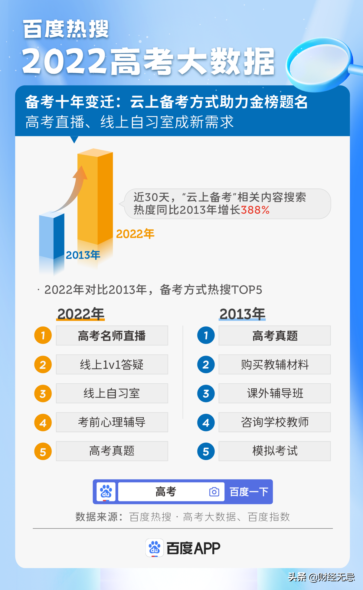 在备战高考的路上,家长是坚强的后盾。百度热搜大数据洞察了陪考方式的十年变迁。2022年高考陪考相关内容搜索热度同比2013年上升了275%。十年前,营养搭配、高考出行安排与高考酒店预订是家长最为关注的高考话题。如今,高考也成为信息战,心理疏导与信息查询是家长陪考期间更为关注的重点。