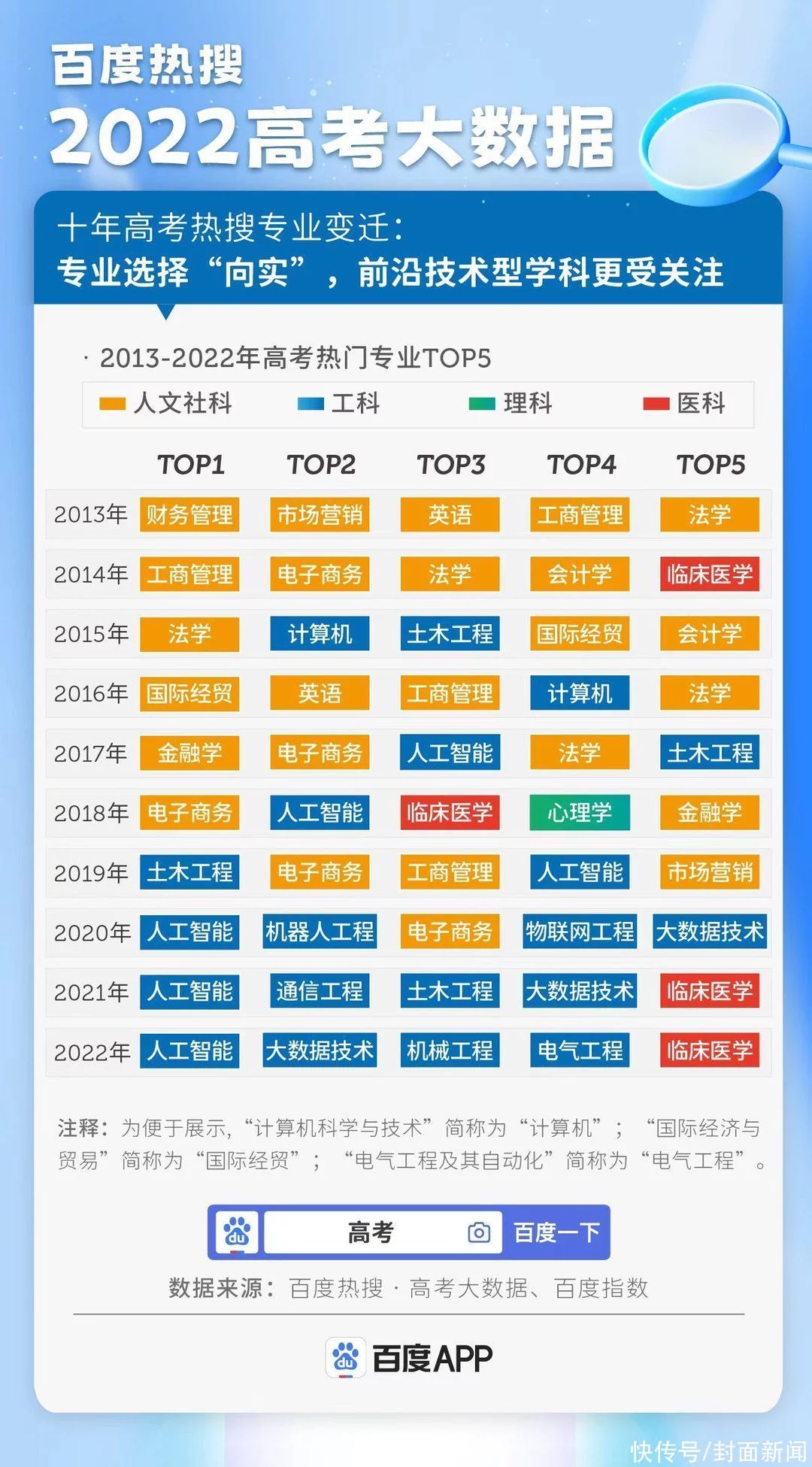 5月31日,百度发布《百度热搜·2022高考大数据》报告。数据显示,疫情防控之下,今年的高考相关内容关注度同比增长93%,高考直播、线上自习室等云上备考方式涌现;考生的志愿选择上,前沿技术型学科更受关注,人工智能连续三年成为搜索热度增幅最高专业,西南大学、西南政法大学热度增幅领跑全国高校。
