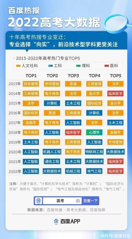 (健康时报记者 赵萌萌)多地高考成绩陆续公布,莘莘学子也将迎来第二关——填报高考志愿。据2022年《百度热搜高考大数据》的统计情况来看,2021-2022年临床医学又重新回归高考热门专业Top5。