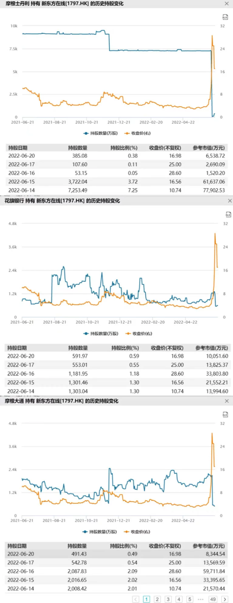而在新东方在线这波剧烈波动的股价中,减持的不止腾讯一家。据Wind资讯数据显示,自6月9日至6月17日,盈透证券、摩根士丹利、摩根大通、花旗银行等机构相继大幅减持新东方在线的股票。