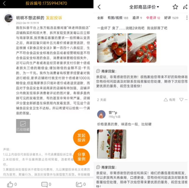 东方甄选火了,但投诉也多了,首当其冲的就是品控问题。在黑猫投诉平台上,有消费者于6月19日投诉在东方甄选直播间购买的味老师旗舰店和田大枣,拆开后发现变质发霉,目前该投诉状态显示在处理过程中。另外,在东方甄选直播间售卖的枝纯串收小番茄,有消费者评价称收到产品存在坏了、发臭问题。