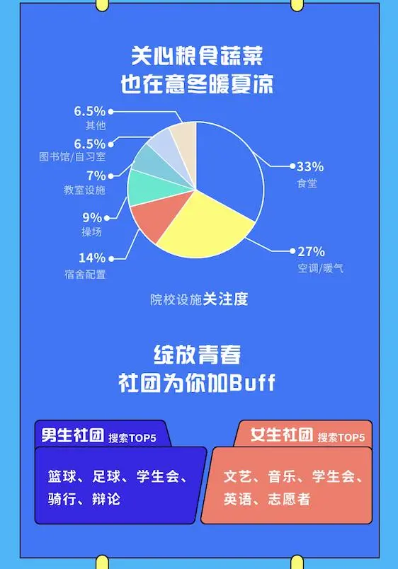 另外,据报告数据显示,考生在搜索专业相关问题时,薪水,就业单位性质,以及毕业去向,都是他们关心的重点。同时,他们对于大学的校内设置也十分关注,食堂、空调、暖气均占据他们关心的要点。