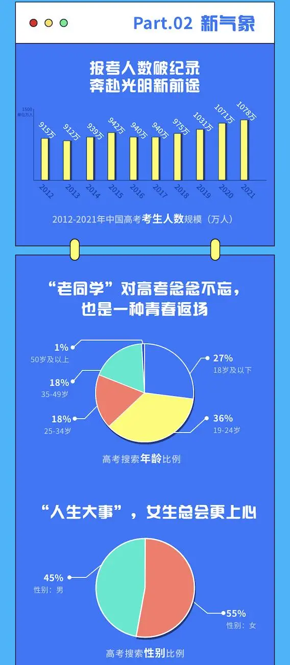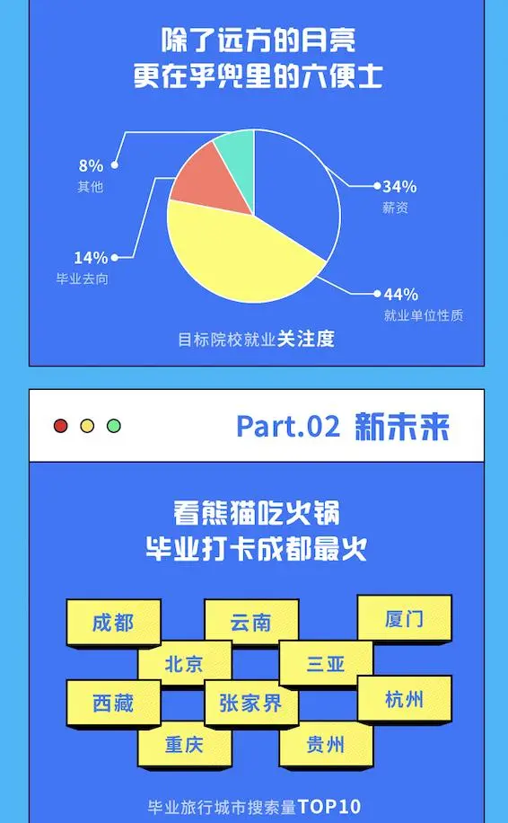 综上所述,可看出这届考生不仅对新兴专业、科技前沿的专业关注度极高,对财经类、军事类、政法类等老牌传统类型院校也十分关注。同时,他们的报考自主性也正在加强,关注维度也更加广泛、更加务实,懂得结合就业单位性质、毕业去向等维度来综合看问题。