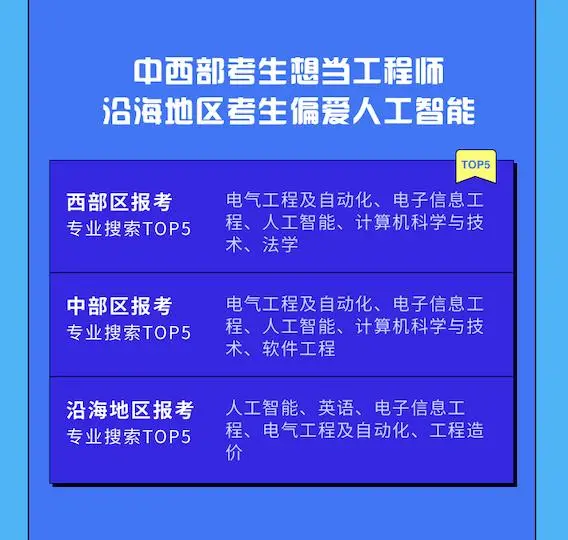 在专业选择上,电气工程及自动化、电子信息工程、人工智能等专业受到的关注最高。其中,电气工程及自动化、电子信息工程、人工智能、计算机科学与技术等专业均已成为中部,以及中西部地区考生搜索量前四。人工智能、英语、电子信息工程、电气工程及自动化、工程造价等专业,则是沿海地区考生的偏爱。