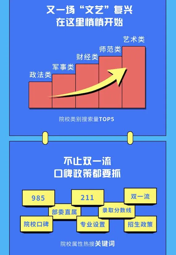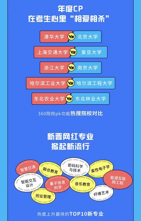 艺术类、师范类、财经类、军事类、政法类成为多省考生院校类别搜索量TOP5;985、211、双一流、部委直属等关键词排在搜索高频词前列。除此之外,智慧交通、融合教育、密码科学与技术、柔性电子学等新晋网红专业,也已受到众多考生关注,成为热度飙升最快的新专业TOP10。