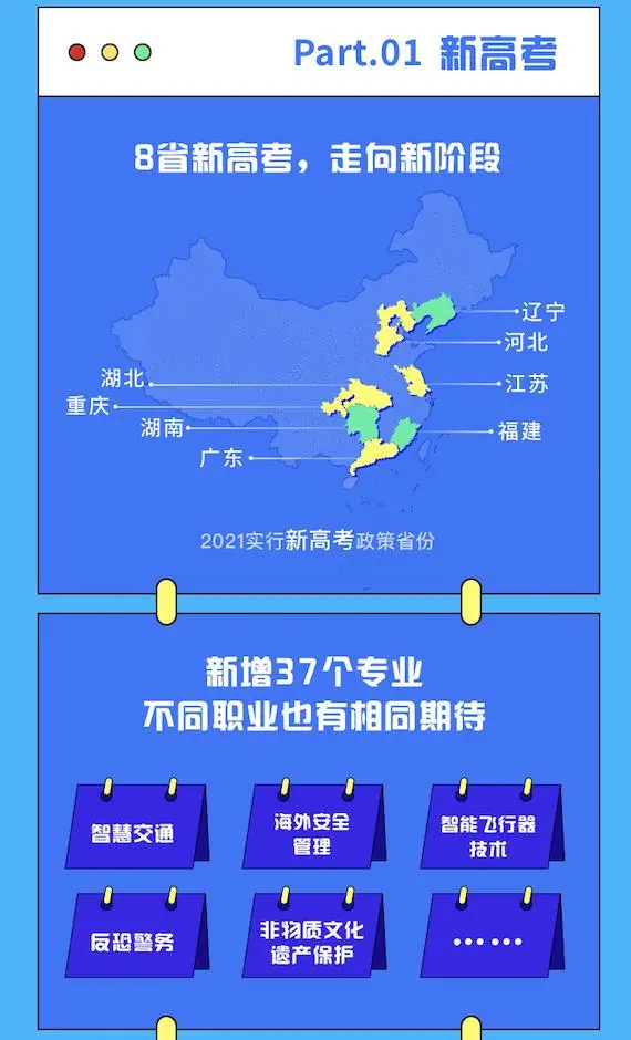 据报告数据显示,2021年报考已出现诸多新变化。首先在政策上,辽宁、河北、江苏、福建、广东、湖北、重庆、湖南八省会实施2021新高考政策。其次在专业上,全国部分院校已增设智慧交通、融合教育、社会政策、反恐警务等37个专业。
