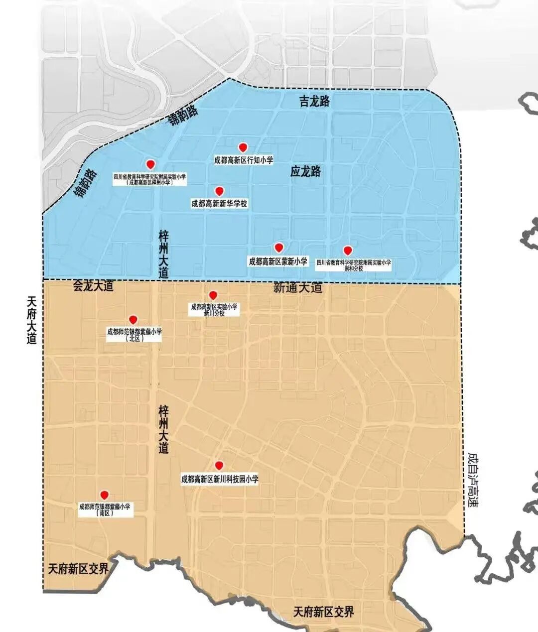 二是中和B片区:会龙大道—新通大道以南,天府新区界以北,天府大道以东,天府新区界以西。2022年,该片区内涉及的学校如下图所示: