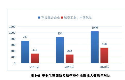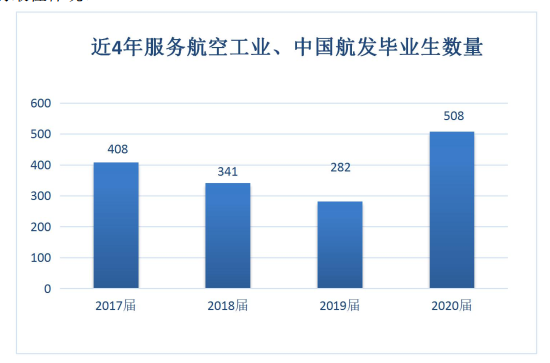 4.重点行业流向2020 届毕业生, 在国防及航空类企业就业毕业生人数为 1554 人(占总人数的比率为 41.34%) , 其中在中国航空工业集团公司就业的毕业生人数为 442 人, 在中国航发发动机集团公司就业人数为 66 人, 毕业后 468 名士官(包括服役空军 215人, 海军 161 人, 武警 92 人) , 在其他军民航企业就业的学生人数为 578 人。 毕业生在中国 500 强企业就业比例为 29%。
