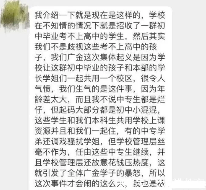 而且最过分的是,其中有一个初中生学弟还来调戏学姐,这让正规考进来的本科生彻底接受不了了。学校里面的其他学生也曾经吐槽过此类事件的发生。