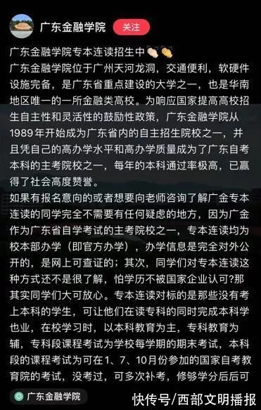 同时,名为广东金融学校的账号在社交平台上对招生政策进行解释:选择专本连读,可以与统招本科生享受同等的教学资源和师资。广东金融学校作为自学考试的主考院校,是官方办学。