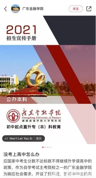在一些平台,部分以广东金融学校或广金预科班等字样命名的账号,发布了广东金融学校继续教育学校大学预科班初中起点直升专(本)科教育的招生宣传手册。