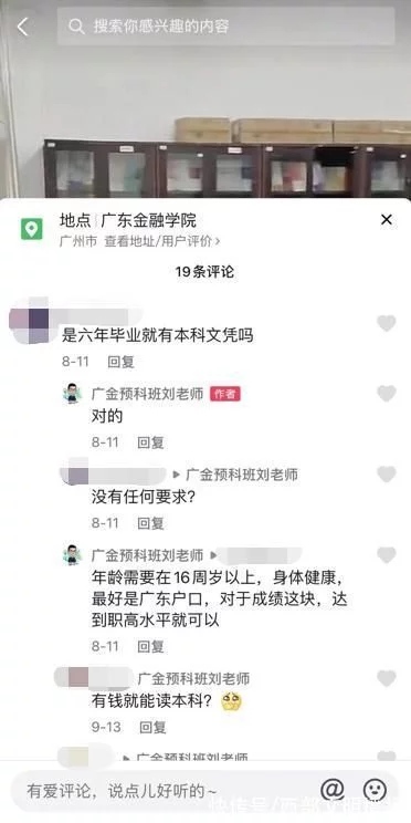 有网友在账号名为广金预科班刘老师的宣传视频下留言提问是六年毕业就有本科文凭吗?该账号给出肯定回答。