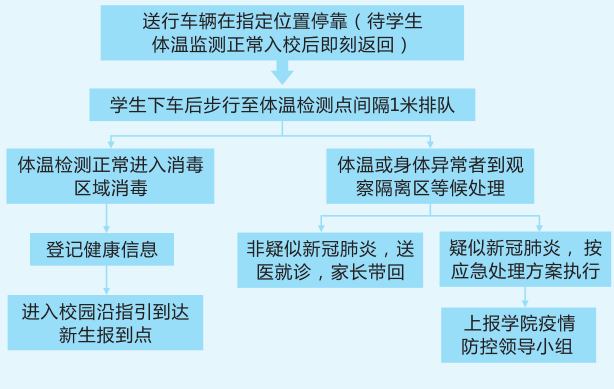 体温、天府健康通正常者方可进入学校,到立志楼一楼大厅报到;体温异常者,需经专用通道,到达临时隔离点,进行复测。若为不明原因的发热症状,立刻转至发热门诊,并将情况如实上报,暂缓报到时间;